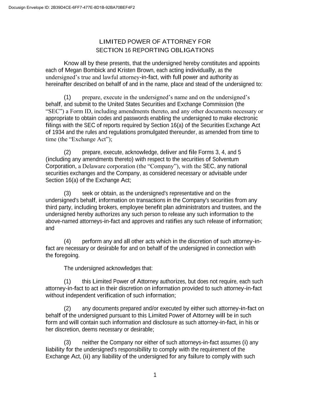 1 LIMITED POWER OF ATTORNEY FOR SECTION 16 REPORTING OBLIGATIONS Know all by these presents, that the undersigned hereby constitutes and appoints each of Megan Bombick and Kristen Brown, each acting individually, as the undersigned’s true and lawful attorney-in-fact, with full power and authority as hereinafter described on behalf of and in the name, place and stead of the undersigned to: (1) prepare, execute in the undersigned’s name and on the undersigned’s behalf, and submit to the United States Securities and Exchange Commission (the “SEC”) a Form ID, including amendments thereto, and any other documents necessary or appropriate to obtain codes and passwords enabling the undersigned to make electronic filings with the SEC of reports required by Section 16(a) of the Securities Exchange Act of 1934 and the rules and regulations promulgated thereunder, as amended from time to time (the “Exchange Act”); (2) prepare, execute, acknowledge, deliver and file Forms 3, 4, and 5 (including any amendments thereto) with respect to the securities of Solventum Corporation, a Delaware corporation (the “Company”), with the SEC, any national securities exchanges and the Company, as considered necessary or advisable under Section 16(a) of the Exchange Act; (3) seek or obtain, as the undersigned's representative and on the undersigned's behalf, information on transactions in the Company's securities from any third party, including brokers, employee benefit plan administrators and trustees, and the undersigned hereby authorizes any such person to release any such information to the above-named attorneys-in-fact and approves and ratifies any such release of information; and (4) perform any and all other acts which in the discretion of such attorney-in- fact are necessary or desirable for and on behalf of the undersigned in connection with the foregoing. The undersigned acknowledges that: (1) this Limited Power of Attorney authorizes, but does not require, each such attorney-in-fact to act in their discretion on information provided to such attorney-in-fact without independent verification of such information; (2) any documents prepared and/or executed by either such attorney-in-fact on behalf of the undersigned pursuant to this Limited Power of Attorney will be in such form and will contain such information and disclosure as such attorney-in-fact, in his or her discretion, deems necessary or desirable; (3) neither the Company nor either of such attorneys-in-fact assumes (i) any liability for the undersigned's responsibility to comply with the requirement of the Exchange Act, (ii) any liability of the undersigned for any failure to comply with such Docusign Envelope ID: 2B39D4CE-6FF7-477E-8D1B-92BA70BEF4F2