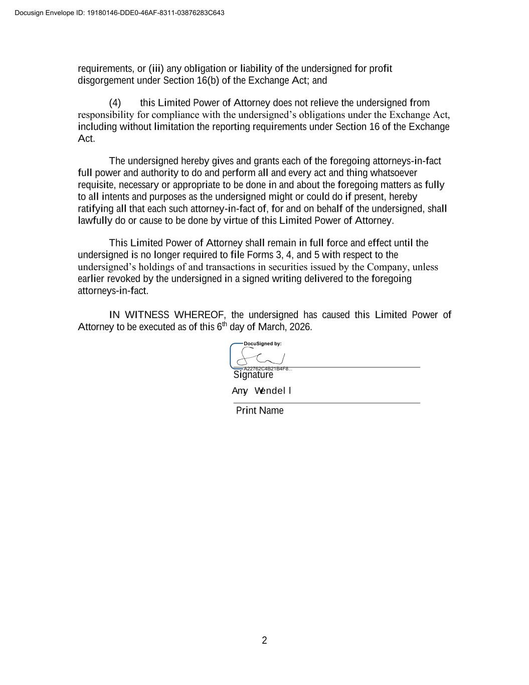2 requirements, or (iii) any obligation or liability of the undersigned for profit disgorgement under Section 16(b) of the Exchange Act; and (4) this Limited Power of Attorney does not relieve the undersigned from responsibility for compliance with the undersigned’s obligations under the Exchange Act, including without limitation the reporting requirements under Section 16 of the Exchange Act. The undersigned hereby gives and grants each of the foregoing attorneys-in-fact full power and authority to do and perform all and every act and thing whatsoever requisite, necessary or appropriate to be done in and about the foregoing matters as fully to all intents and purposes as the undersigned might or could do if present, hereby ratifying all that each such attorney-in-fact of, for and on behalf of the undersigned, shall lawfully do or cause to be done by virtue of this Limited Power of Attorney. This Limited Power of Attorney shall remain in full force and effect until the undersigned is no longer required to file Forms 3, 4, and 5 with respect to the undersigned’s holdings of and transactions in securities issued by the Company, unless earlier revoked by the undersigned in a signed writing delivered to the foregoing attorneys-in-fact. IN WITNESS WHEREOF, the undersigned has caused this Limited Power of Attorney to be executed as of this 6th day of March, 2026. Signature Print Name Docusign Envelope ID: 19180146-DDE0-46AF-8311-03876283C643 Amy Wendell