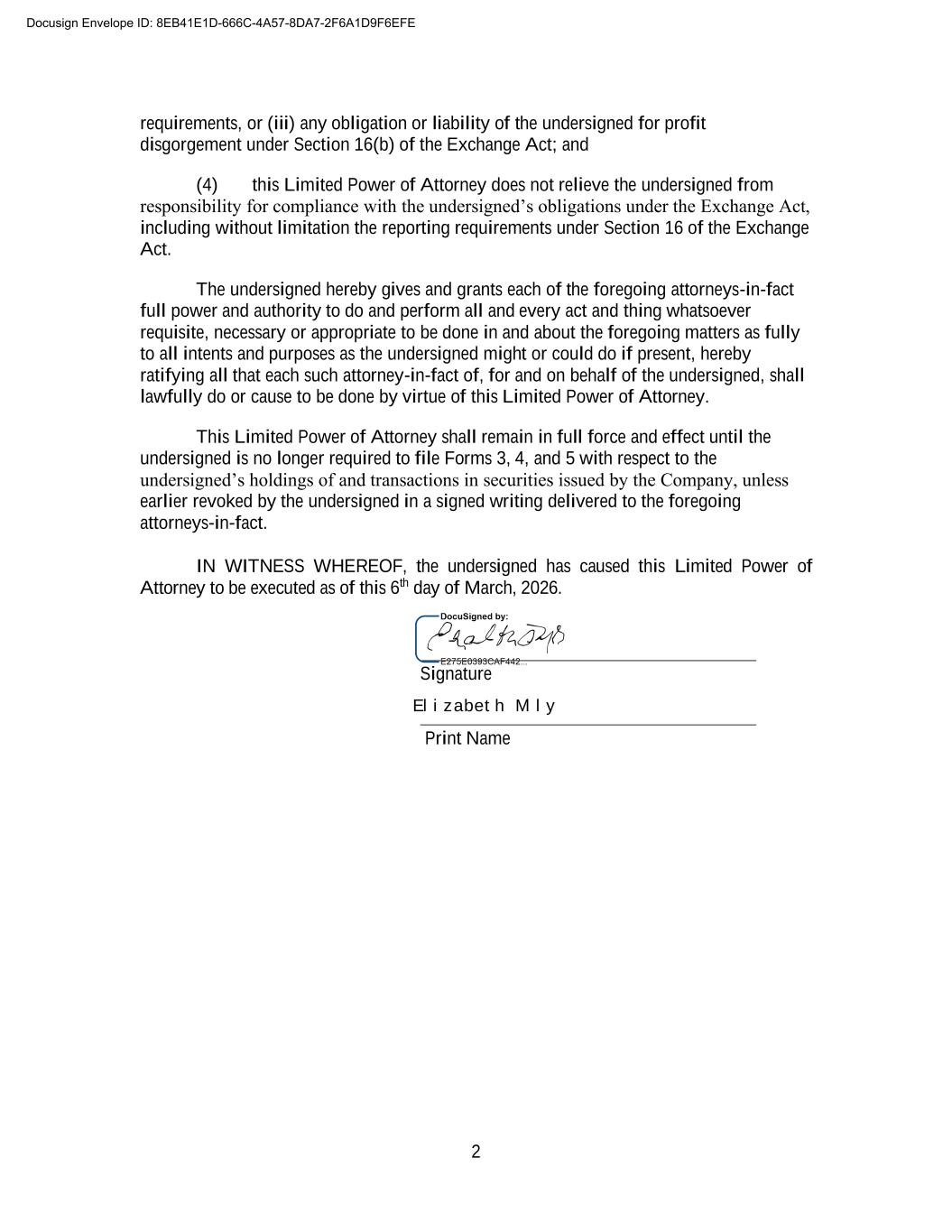 2 requirements, or (iii) any obligation or liability of the undersigned for profit disgorgement under Section 16(b) of the Exchange Act; and (4) this Limited Power of Attorney does not relieve the undersigned from responsibility for compliance with the undersigned’s obligations under the Exchange Act, including without limitation the reporting requirements under Section 16 of the Exchange Act. The undersigned hereby gives and grants each of the foregoing attorneys-in-fact full power and authority to do and perform all and every act and thing whatsoever requisite, necessary or appropriate to be done in and about the foregoing matters as fully to all intents and purposes as the undersigned might or could do if present, hereby ratifying all that each such attorney-in-fact of, for and on behalf of the undersigned, shall lawfully do or cause to be done by virtue of this Limited Power of Attorney. This Limited Power of Attorney shall remain in full force and effect until the undersigned is no longer required to file Forms 3, 4, and 5 with respect to the undersigned’s holdings of and transactions in securities issued by the Company, unless earlier revoked by the undersigned in a signed writing delivered to the foregoing attorneys-in-fact. IN WITNESS WHEREOF, the undersigned has caused this Limited Power of Attorney to be executed as of this 6th day of March, 2026. Signature Print Name Docusign Envelope ID: 8EB41E1D-666C-4A57-8DA7-2F6A1D9F6EFE Elizabeth Mily