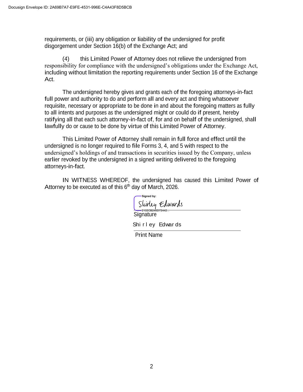 2 requirements, or (iii) any obligation or liability of the undersigned for profit disgorgement under Section 16(b) of the Exchange Act; and (4) this Limited Power of Attorney does not relieve the undersigned from responsibility for compliance with the undersigned’s obligations under the Exchange Act, including without limitation the reporting requirements under Section 16 of the Exchange Act. The undersigned hereby gives and grants each of the foregoing attorneys-in-fact full power and authority to do and perform all and every act and thing whatsoever requisite, necessary or appropriate to be done in and about the foregoing matters as fully to all intents and purposes as the undersigned might or could do if present, hereby ratifying all that each such attorney-in-fact of, for and on behalf of the undersigned, shall lawfully do or cause to be done by virtue of this Limited Power of Attorney. This Limited Power of Attorney shall remain in full force and effect until the undersigned is no longer required to file Forms 3, 4, and 5 with respect to the undersigned’s holdings of and transactions in securities issued by the Company, unless earlier revoked by the undersigned in a signed writing delivered to the foregoing attorneys-in-fact. IN WITNESS WHEREOF, the undersigned has caused this Limited Power of Attorney to be executed as of this 6th day of March, 2026. Signature Print Name Docusign Envelope ID: 2A69B7A7-E9FE-4531-996E-C4A43F8D5BCB Shirley Edwards