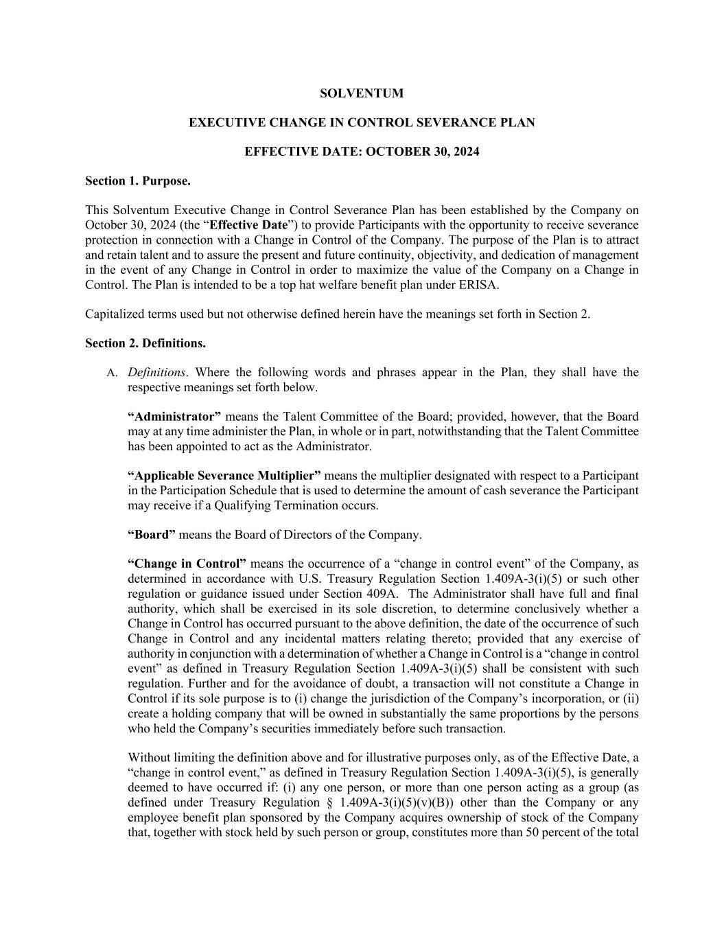 SOLVENTUM EXECUTIVE CHANGE IN CONTROL SEVERANCE PLAN EFFECTIVE DATE: OCTOBER 30, 2024 Section 1. Purpose. This Solventum Executive Change in Control Severance Plan has been established by the Company on October 30, 2024 (the “Effective Date”) to provide Participants with the opportunity to receive severance protection in connection with a Change in Control of the Company. The purpose of the Plan is to attract and retain talent and to assure the present and future continuity, objectivity, and dedication of management in the event of any Change in Control in order to maximize the value of the Company on a Change in Control. The Plan is intended to be a top hat welfare benefit plan under ERISA. Capitalized terms used but not otherwise defined herein have the meanings set forth in Section 2. Section 2. Definitions. A. Definitions. Where the following words and phrases appear in the Plan, they shall have the respective meanings set forth below. “Administrator” means the Talent Committee of the Board; provided, however, that the Board may at any time administer the Plan, in whole or in part, notwithstanding that the Talent Committee has been appointed to act as the Administrator. “Applicable Severance Multiplier” means the multiplier designated with respect to a Participant in the Participation Schedule that is used to determine the amount of cash severance the Participant may receive if a Qualifying Termination occurs. “Board” means the Board of Directors of the Company. “Change in Control” means the occurrence of a “change in control event” of the Company, as determined in accordance with U.S. Treasury Regulation Section 1.409A-3(i)(5) or such other regulation or guidance issued under Section 409A. The Administrator shall have full and final authority, which shall be exercised in its sole discretion, to determine conclusively whether a Change in Control has occurred pursuant to the above definition, the date of the occurrence of such Change in Control and any incidental matters relating thereto; provided that any exercise of authority in conjunction with a determination of whether a Change in Control is a “change in control event” as defined in Treasury Regulation Section 1.409A-3(i)(5) shall be consistent with such regulation. Further and for the avoidance of doubt, a transaction will not constitute a Change in Control if its sole purpose is to (i) change the jurisdiction of the Company’s incorporation, or (ii) create a holding company that will be owned in substantially the same proportions by the persons who held the Company’s securities immediately before such transaction. Without limiting the definition above and for illustrative purposes only, as of the Effective Date, a “change in control event,” as defined in Treasury Regulation Section 1.409A-3(i)(5), is generally deemed to have occurred if: (i) any one person, or more than one person acting as a group (as defined under Treasury Regulation § 1.409A-3(i)(5)(v)(B)) other than the Company or any employee benefit plan sponsored by the Company acquires ownership of stock of the Company that, together with stock held by such person or group, constitutes more than 50 percent of the total