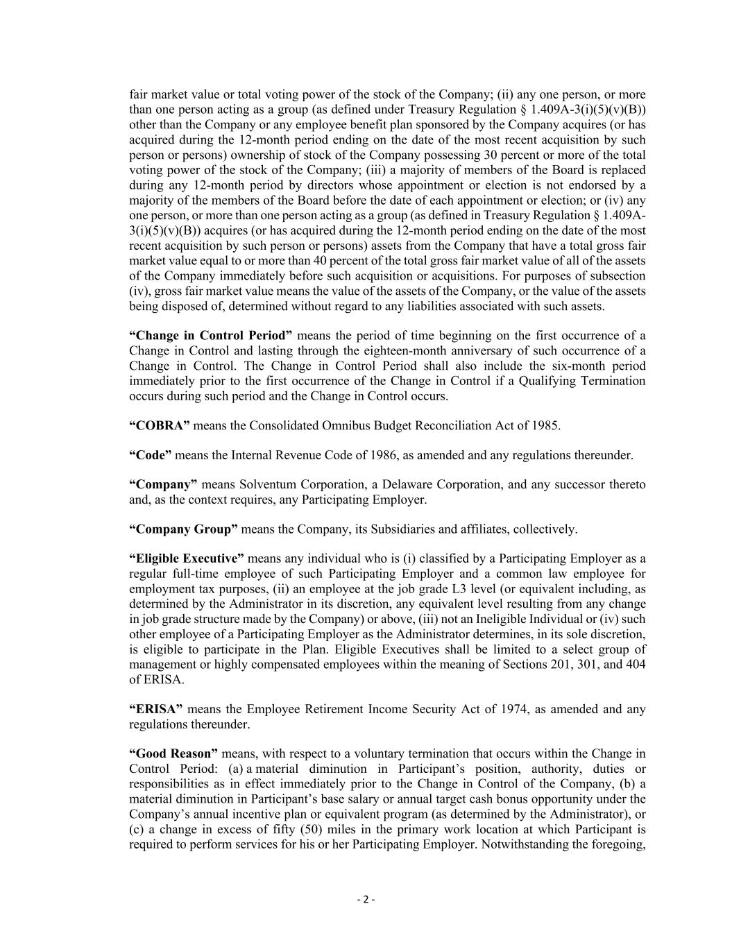 - 2 - fair market value or total voting power of the stock of the Company; (ii) any one person, or more than one person acting as a group (as defined under Treasury Regulation § 1.409A-3(i)(5)(v)(B)) other than the Company or any employee benefit plan sponsored by the Company acquires (or has acquired during the 12-month period ending on the date of the most recent acquisition by such person or persons) ownership of stock of the Company possessing 30 percent or more of the total voting power of the stock of the Company; (iii) a majority of members of the Board is replaced during any 12-month period by directors whose appointment or election is not endorsed by a majority of the members of the Board before the date of each appointment or election; or (iv) any one person, or more than one person acting as a group (as defined in Treasury Regulation § 1.409A- 3(i)(5)(v)(B)) acquires (or has acquired during the 12-month period ending on the date of the most recent acquisition by such person or persons) assets from the Company that have a total gross fair market value equal to or more than 40 percent of the total gross fair market value of all of the assets of the Company immediately before such acquisition or acquisitions. For purposes of subsection (iv), gross fair market value means the value of the assets of the Company, or the value of the assets being disposed of, determined without regard to any liabilities associated with such assets. “Change in Control Period” means the period of time beginning on the first occurrence of a Change in Control and lasting through the eighteen-month anniversary of such occurrence of a Change in Control. The Change in Control Period shall also include the six-month period immediately prior to the first occurrence of the Change in Control if a Qualifying Termination occurs during such period and the Change in Control occurs. “COBRA” means the Consolidated Omnibus Budget Reconciliation Act of 1985. “Code” means the Internal Revenue Code of 1986, as amended and any regulations thereunder. “Company” means Solventum Corporation, a Delaware Corporation, and any successor thereto and, as the context requires, any Participating Employer. “Company Group” means the Company, its Subsidiaries and affiliates, collectively. “Eligible Executive” means any individual who is (i) classified by a Participating Employer as a regular full-time employee of such Participating Employer and a common law employee for employment tax purposes, (ii) an employee at the job grade L3 level (or equivalent including, as determined by the Administrator in its discretion, any equivalent level resulting from any change in job grade structure made by the Company) or above, (iii) not an Ineligible Individual or (iv) such other employee of a Participating Employer as the Administrator determines, in its sole discretion, is eligible to participate in the Plan. Eligible Executives shall be limited to a select group of management or highly compensated employees within the meaning of Sections 201, 301, and 404 of ERISA. “ERISA” means the Employee Retirement Income Security Act of 1974, as amended and any regulations thereunder. “Good Reason” means, with respect to a voluntary termination that occurs within the Change in Control Period: (a) a material diminution in Participant’s position, authority, duties or responsibilities as in effect immediately prior to the Change in Control of the Company, (b) a material diminution in Participant’s base salary or annual target cash bonus opportunity under the Company’s annual incentive plan or equivalent program (as determined by the Administrator), or (c) a change in excess of fifty (50) miles in the primary work location at which Participant is required to perform services for his or her Participating Employer. Notwithstanding the foregoing,