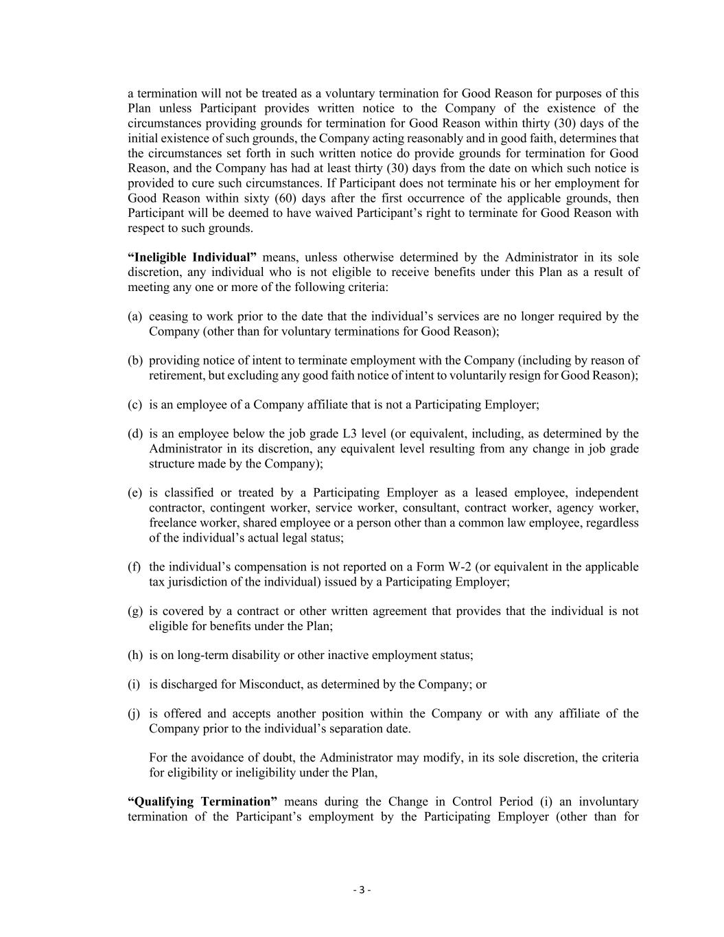 - 3 - a termination will not be treated as a voluntary termination for Good Reason for purposes of this Plan unless Participant provides written notice to the Company of the existence of the circumstances providing grounds for termination for Good Reason within thirty (30) days of the initial existence of such grounds, the Company acting reasonably and in good faith, determines that the circumstances set forth in such written notice do provide grounds for termination for Good Reason, and the Company has had at least thirty (30) days from the date on which such notice is provided to cure such circumstances. If Participant does not terminate his or her employment for Good Reason within sixty (60) days after the first occurrence of the applicable grounds, then Participant will be deemed to have waived Participant’s right to terminate for Good Reason with respect to such grounds. “Ineligible Individual” means, unless otherwise determined by the Administrator in its sole discretion, any individual who is not eligible to receive benefits under this Plan as a result of meeting any one or more of the following criteria: (a) ceasing to work prior to the date that the individual’s services are no longer required by the Company (other than for voluntary terminations for Good Reason); (b) providing notice of intent to terminate employment with the Company (including by reason of retirement, but excluding any good faith notice of intent to voluntarily resign for Good Reason); (c) is an employee of a Company affiliate that is not a Participating Employer; (d) is an employee below the job grade L3 level (or equivalent, including, as determined by the Administrator in its discretion, any equivalent level resulting from any change in job grade structure made by the Company); (e) is classified or treated by a Participating Employer as a leased employee, independent contractor, contingent worker, service worker, consultant, contract worker, agency worker, freelance worker, shared employee or a person other than a common law employee, regardless of the individual’s actual legal status; (f) the individual’s compensation is not reported on a Form W-2 (or equivalent in the applicable tax jurisdiction of the individual) issued by a Participating Employer; (g) is covered by a contract or other written agreement that provides that the individual is not eligible for benefits under the Plan; (h) is on long-term disability or other inactive employment status; (i) is discharged for Misconduct, as determined by the Company; or (j) is offered and accepts another position within the Company or with any affiliate of the Company prior to the individual’s separation date. For the avoidance of doubt, the Administrator may modify, in its sole discretion, the criteria for eligibility or ineligibility under the Plan, “Qualifying Termination” means during the Change in Control Period (i) an involuntary termination of the Participant’s employment by the Participating Employer (other than for