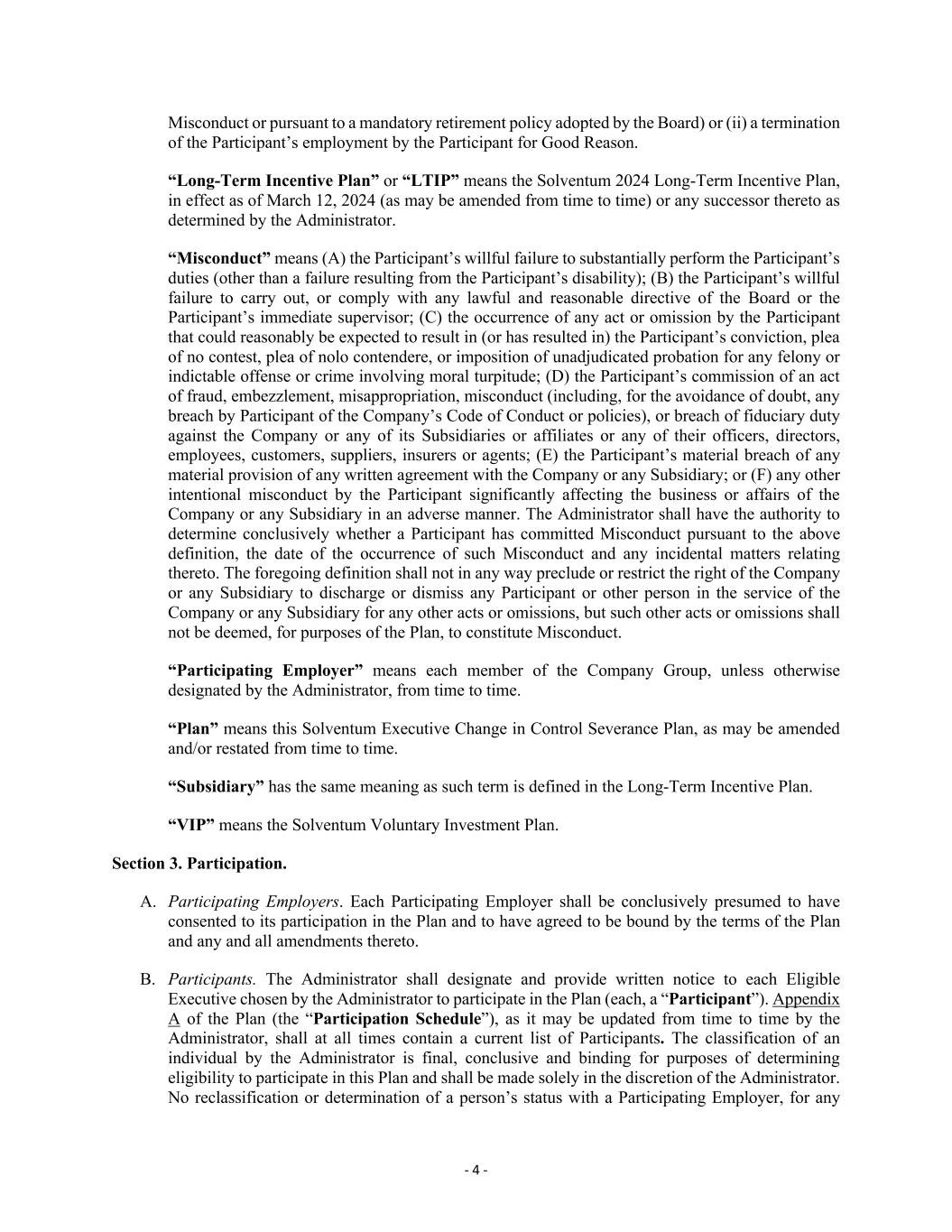 - 4 - Misconduct or pursuant to a mandatory retirement policy adopted by the Board) or (ii) a termination of the Participant’s employment by the Participant for Good Reason. “Long-Term Incentive Plan” or “LTIP” means the Solventum 2024 Long-Term Incentive Plan, in effect as of March 12, 2024 (as may be amended from time to time) or any successor thereto as determined by the Administrator. “Misconduct” means (A) the Participant’s willful failure to substantially perform the Participant’s duties (other than a failure resulting from the Participant’s disability); (B) the Participant’s willful failure to carry out, or comply with any lawful and reasonable directive of the Board or the Participant’s immediate supervisor; (C) the occurrence of any act or omission by the Participant that could reasonably be expected to result in (or has resulted in) the Participant’s conviction, plea of no contest, plea of nolo contendere, or imposition of unadjudicated probation for any felony or indictable offense or crime involving moral turpitude; (D) the Participant’s commission of an act of fraud, embezzlement, misappropriation, misconduct (including, for the avoidance of doubt, any breach by Participant of the Company’s Code of Conduct or policies), or breach of fiduciary duty against the Company or any of its Subsidiaries or affiliates or any of their officers, directors, employees, customers, suppliers, insurers or agents; (E) the Participant’s material breach of any material provision of any written agreement with the Company or any Subsidiary; or (F) any other intentional misconduct by the Participant significantly affecting the business or affairs of the Company or any Subsidiary in an adverse manner. The Administrator shall have the authority to determine conclusively whether a Participant has committed Misconduct pursuant to the above definition, the date of the occurrence of such Misconduct and any incidental matters relating thereto. The foregoing definition shall not in any way preclude or restrict the right of the Company or any Subsidiary to discharge or dismiss any Participant or other person in the service of the Company or any Subsidiary for any other acts or omissions, but such other acts or omissions shall not be deemed, for purposes of the Plan, to constitute Misconduct. “Participating Employer” means each member of the Company Group, unless otherwise designated by the Administrator, from time to time. “Plan” means this Solventum Executive Change in Control Severance Plan, as may be amended and/or restated from time to time. “Subsidiary” has the same meaning as such term is defined in the Long-Term Incentive Plan. “VIP” means the Solventum Voluntary Investment Plan. Section 3. Participation. A. Participating Employers. Each Participating Employer shall be conclusively presumed to have consented to its participation in the Plan and to have agreed to be bound by the terms of the Plan and any and all amendments thereto. B. Participants. The Administrator shall designate and provide written notice to each Eligible Executive chosen by the Administrator to participate in the Plan (each, a “Participant”). Appendix A of the Plan (the “Participation Schedule”), as it may be updated from time to time by the Administrator, shall at all times contain a current list of Participants. The classification of an individual by the Administrator is final, conclusive and binding for purposes of determining eligibility to participate in this Plan and shall be made solely in the discretion of the Administrator. No reclassification or determination of a person’s status with a Participating Employer, for any