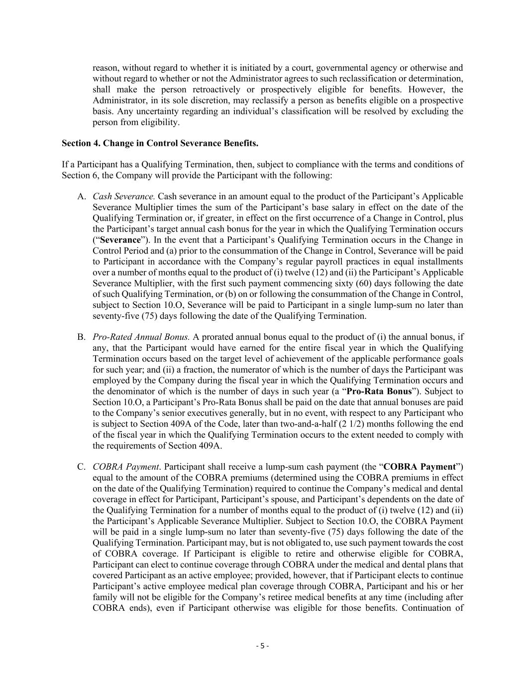 - 5 - reason, without regard to whether it is initiated by a court, governmental agency or otherwise and without regard to whether or not the Administrator agrees to such reclassification or determination, shall make the person retroactively or prospectively eligible for benefits. However, the Administrator, in its sole discretion, may reclassify a person as benefits eligible on a prospective basis. Any uncertainty regarding an individual’s classification will be resolved by excluding the person from eligibility. Section 4. Change in Control Severance Benefits. If a Participant has a Qualifying Termination, then, subject to compliance with the terms and conditions of Section 6, the Company will provide the Participant with the following: A. Cash Severance. Cash severance in an amount equal to the product of the Participant’s Applicable Severance Multiplier times the sum of the Participant’s base salary in effect on the date of the Qualifying Termination or, if greater, in effect on the first occurrence of a Change in Control, plus the Participant’s target annual cash bonus for the year in which the Qualifying Termination occurs (“Severance”). In the event that a Participant’s Qualifying Termination occurs in the Change in Control Period and (a) prior to the consummation of the Change in Control, Severance will be paid to Participant in accordance with the Company’s regular payroll practices in equal installments over a number of months equal to the product of (i) twelve (12) and (ii) the Participant’s Applicable Severance Multiplier, with the first such payment commencing sixty (60) days following the date of such Qualifying Termination, or (b) on or following the consummation of the Change in Control, subject to Section 10.O, Severance will be paid to Participant in a single lump-sum no later than seventy-five (75) days following the date of the Qualifying Termination. B. Pro-Rated Annual Bonus. A prorated annual bonus equal to the product of (i) the annual bonus, if any, that the Participant would have earned for the entire fiscal year in which the Qualifying Termination occurs based on the target level of achievement of the applicable performance goals for such year; and (ii) a fraction, the numerator of which is the number of days the Participant was employed by the Company during the fiscal year in which the Qualifying Termination occurs and the denominator of which is the number of days in such year (a “Pro-Rata Bonus”). Subject to Section 10.O, a Participant’s Pro-Rata Bonus shall be paid on the date that annual bonuses are paid to the Company’s senior executives generally, but in no event, with respect to any Participant who is subject to Section 409A of the Code, later than two-and-a-half (2 1/2) months following the end of the fiscal year in which the Qualifying Termination occurs to the extent needed to comply with the requirements of Section 409A. C. COBRA Payment. Participant shall receive a lump-sum cash payment (the “COBRA Payment”) equal to the amount of the COBRA premiums (determined using the COBRA premiums in effect on the date of the Qualifying Termination) required to continue the Company’s medical and dental coverage in effect for Participant, Participant’s spouse, and Participant’s dependents on the date of the Qualifying Termination for a number of months equal to the product of (i) twelve (12) and (ii) the Participant’s Applicable Severance Multiplier. Subject to Section 10.O, the COBRA Payment will be paid in a single lump-sum no later than seventy-five (75) days following the date of the Qualifying Termination. Participant may, but is not obligated to, use such payment towards the cost of COBRA coverage. If Participant is eligible to retire and otherwise eligible for COBRA, Participant can elect to continue coverage through COBRA under the medical and dental plans that covered Participant as an active employee; provided, however, that if Participant elects to continue Participant’s active employee medical plan coverage through COBRA, Participant and his or her family will not be eligible for the Company’s retiree medical benefits at any time (including after COBRA ends), even if Participant otherwise was eligible for those benefits. Continuation of