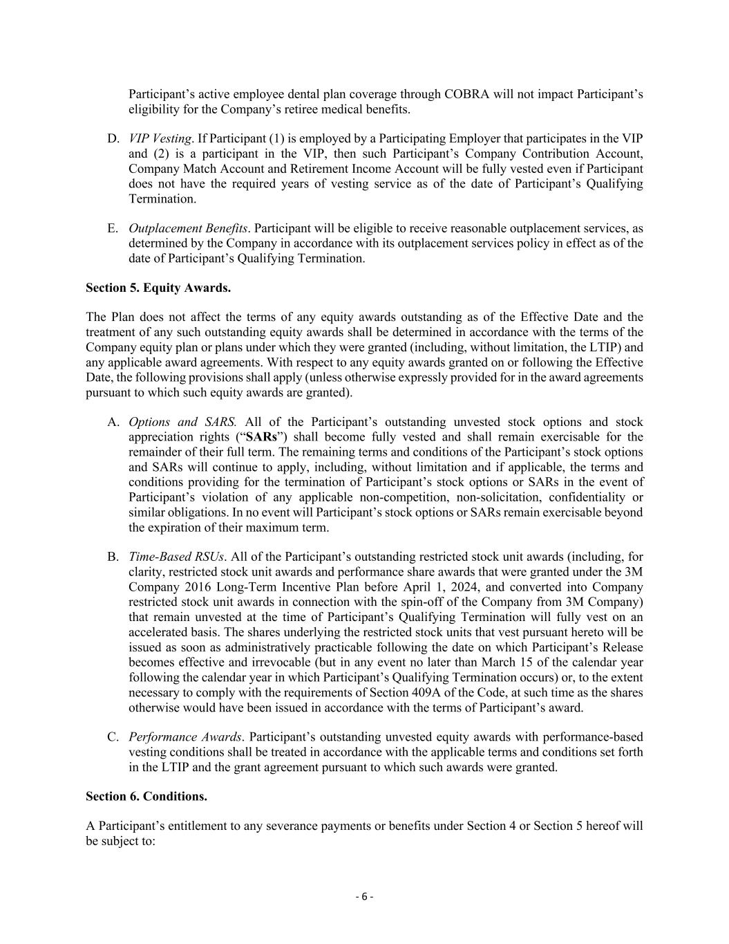 - 6 - Participant’s active employee dental plan coverage through COBRA will not impact Participant’s eligibility for the Company’s retiree medical benefits. D. VIP Vesting. If Participant (1) is employed by a Participating Employer that participates in the VIP and (2) is a participant in the VIP, then such Participant’s Company Contribution Account, Company Match Account and Retirement Income Account will be fully vested even if Participant does not have the required years of vesting service as of the date of Participant’s Qualifying Termination. E. Outplacement Benefits. Participant will be eligible to receive reasonable outplacement services, as determined by the Company in accordance with its outplacement services policy in effect as of the date of Participant’s Qualifying Termination. Section 5. Equity Awards. The Plan does not affect the terms of any equity awards outstanding as of the Effective Date and the treatment of any such outstanding equity awards shall be determined in accordance with the terms of the Company equity plan or plans under which they were granted (including, without limitation, the LTIP) and any applicable award agreements. With respect to any equity awards granted on or following the Effective Date, the following provisions shall apply (unless otherwise expressly provided for in the award agreements pursuant to which such equity awards are granted). A. Options and SARS. All of the Participant’s outstanding unvested stock options and stock appreciation rights (“SARs”) shall become fully vested and shall remain exercisable for the remainder of their full term. The remaining terms and conditions of the Participant’s stock options and SARs will continue to apply, including, without limitation and if applicable, the terms and conditions providing for the termination of Participant’s stock options or SARs in the event of Participant’s violation of any applicable non-competition, non-solicitation, confidentiality or similar obligations. In no event will Participant’s stock options or SARs remain exercisable beyond the expiration of their maximum term. B. Time-Based RSUs. All of the Participant’s outstanding restricted stock unit awards (including, for clarity, restricted stock unit awards and performance share awards that were granted under the 3M Company 2016 Long-Term Incentive Plan before April 1, 2024, and converted into Company restricted stock unit awards in connection with the spin-off of the Company from 3M Company) that remain unvested at the time of Participant’s Qualifying Termination will fully vest on an accelerated basis. The shares underlying the restricted stock units that vest pursuant hereto will be issued as soon as administratively practicable following the date on which Participant’s Release becomes effective and irrevocable (but in any event no later than March 15 of the calendar year following the calendar year in which Participant’s Qualifying Termination occurs) or, to the extent necessary to comply with the requirements of Section 409A of the Code, at such time as the shares otherwise would have been issued in accordance with the terms of Participant’s award. C. Performance Awards. Participant’s outstanding unvested equity awards with performance-based vesting conditions shall be treated in accordance with the applicable terms and conditions set forth in the LTIP and the grant agreement pursuant to which such awards were granted. Section 6. Conditions. A Participant’s entitlement to any severance payments or benefits under Section 4 or Section 5 hereof will be subject to: