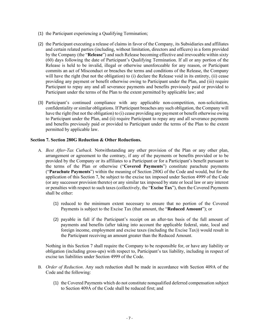 - 7 - (1) the Participant experiencing a Qualifying Termination; (2) the Participant executing a release of claims in favor of the Company, its Subsidiaries and affiliates and certain related parties (including, without limitation, directors and officers) in a form provided by the Company (the “Release”) and such Release becoming effective and irrevocable within sixty (60) days following the date of Participant’s Qualifying Termination. If all or any portion of the Release is held to be invalid, illegal or otherwise unenforceable for any reason, or Participant commits an act of Misconduct or breaches the terms and conditions of the Release, the Company will have the right (but not the obligation) to (i) declare the Release void in its entirety, (ii) cease providing any payment or benefit otherwise owing to Participant under the Plan, and (iii) require Participant to repay any and all severance payments and benefits previously paid or provided to Participant under the terms of the Plan to the extent permitted by applicable law; and (3) Participant’s continued compliance with any applicable non-competition, non-solicitation, confidentiality or similar obligations. If Participant breaches any such obligation, the Company will have the right (but not the obligation) to (i) cease providing any payment or benefit otherwise owing to Participant under the Plan, and (ii) require Participant to repay any and all severance payments and benefits previously paid or provided to Participant under the terms of the Plan to the extent permitted by applicable law. Section 7. Section 280G Reduction & Other Reductions. A. Best After-Tax Cutback. Notwithstanding any other provision of the Plan or any other plan, arrangement or agreement to the contrary, if any of the payments or benefits provided or to be provided by the Company or its affiliates to a Participant or for a Participant’s benefit pursuant to the terms of the Plan or otherwise (“Covered Payments”) constitute parachute payments (“Parachute Payments”) within the meaning of Section 280G of the Code and would, but for the application of this Section 7, be subject to the excise tax imposed under Section 4999 of the Code (or any successor provision thereto) or any similar tax imposed by state or local law or any interest or penalties with respect to such taxes (collectively, the “Excise Tax”), then the Covered Payments shall be either: (1) reduced to the minimum extent necessary to ensure that no portion of the Covered Payments is subject to the Excise Tax (that amount, the “Reduced Amount”); or (2) payable in full if the Participant’s receipt on an after-tax basis of the full amount of payments and benefits (after taking into account the applicable federal, state, local and foreign income, employment and excise taxes (including the Excise Tax)) would result in the Participant receiving an amount greater than the Reduced Amount. Nothing in this Section 7 shall require the Company to be responsible for, or have any liability or obligation (including gross-ups) with respect to, Participant’s tax liability, including in respect of excise tax liabilities under Section 4999 of the Code. B. Order of Reduction. Any such reduction shall be made in accordance with Section 409A of the Code and the following: (1) the Covered Payments which do not constitute nonqualified deferred compensation subject to Section 409A of the Code shall be reduced first; and