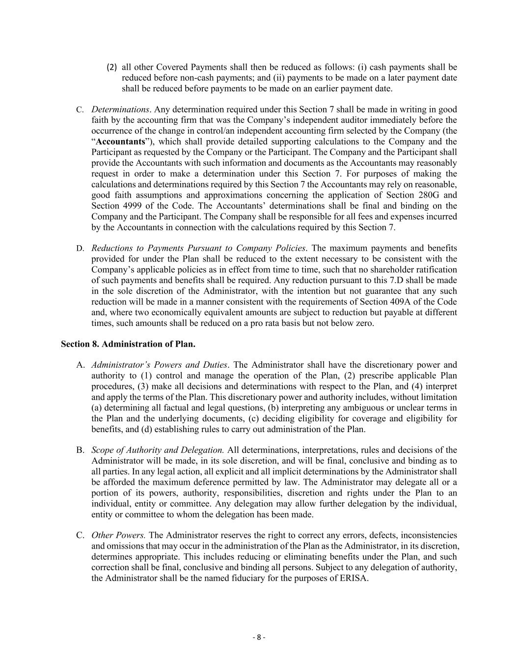 - 8 - (2) all other Covered Payments shall then be reduced as follows: (i) cash payments shall be reduced before non-cash payments; and (ii) payments to be made on a later payment date shall be reduced before payments to be made on an earlier payment date. C. Determinations. Any determination required under this Section 7 shall be made in writing in good faith by the accounting firm that was the Company’s independent auditor immediately before the occurrence of the change in control/an independent accounting firm selected by the Company (the “Accountants”), which shall provide detailed supporting calculations to the Company and the Participant as requested by the Company or the Participant. The Company and the Participant shall provide the Accountants with such information and documents as the Accountants may reasonably request in order to make a determination under this Section 7. For purposes of making the calculations and determinations required by this Section 7 the Accountants may rely on reasonable, good faith assumptions and approximations concerning the application of Section 280G and Section 4999 of the Code. The Accountants’ determinations shall be final and binding on the Company and the Participant. The Company shall be responsible for all fees and expenses incurred by the Accountants in connection with the calculations required by this Section 7. D. Reductions to Payments Pursuant to Company Policies. The maximum payments and benefits provided for under the Plan shall be reduced to the extent necessary to be consistent with the Company’s applicable policies as in effect from time to time, such that no shareholder ratification of such payments and benefits shall be required. Any reduction pursuant to this 7.D shall be made in the sole discretion of the Administrator, with the intention but not guarantee that any such reduction will be made in a manner consistent with the requirements of Section 409A of the Code and, where two economically equivalent amounts are subject to reduction but payable at different times, such amounts shall be reduced on a pro rata basis but not below zero. Section 8. Administration of Plan. A. Administrator’s Powers and Duties. The Administrator shall have the discretionary power and authority to (1) control and manage the operation of the Plan, (2) prescribe applicable Plan procedures, (3) make all decisions and determinations with respect to the Plan, and (4) interpret and apply the terms of the Plan. This discretionary power and authority includes, without limitation (a) determining all factual and legal questions, (b) interpreting any ambiguous or unclear terms in the Plan and the underlying documents, (c) deciding eligibility for coverage and eligibility for benefits, and (d) establishing rules to carry out administration of the Plan. B. Scope of Authority and Delegation. All determinations, interpretations, rules and decisions of the Administrator will be made, in its sole discretion, and will be final, conclusive and binding as to all parties. In any legal action, all explicit and all implicit determinations by the Administrator shall be afforded the maximum deference permitted by law. The Administrator may delegate all or a portion of its powers, authority, responsibilities, discretion and rights under the Plan to an individual, entity or committee. Any delegation may allow further delegation by the individual, entity or committee to whom the delegation has been made. C. Other Powers. The Administrator reserves the right to correct any errors, defects, inconsistencies and omissions that may occur in the administration of the Plan as the Administrator, in its discretion, determines appropriate. This includes reducing or eliminating benefits under the Plan, and such correction shall be final, conclusive and binding all persons. Subject to any delegation of authority, the Administrator shall be the named fiduciary for the purposes of ERISA.
