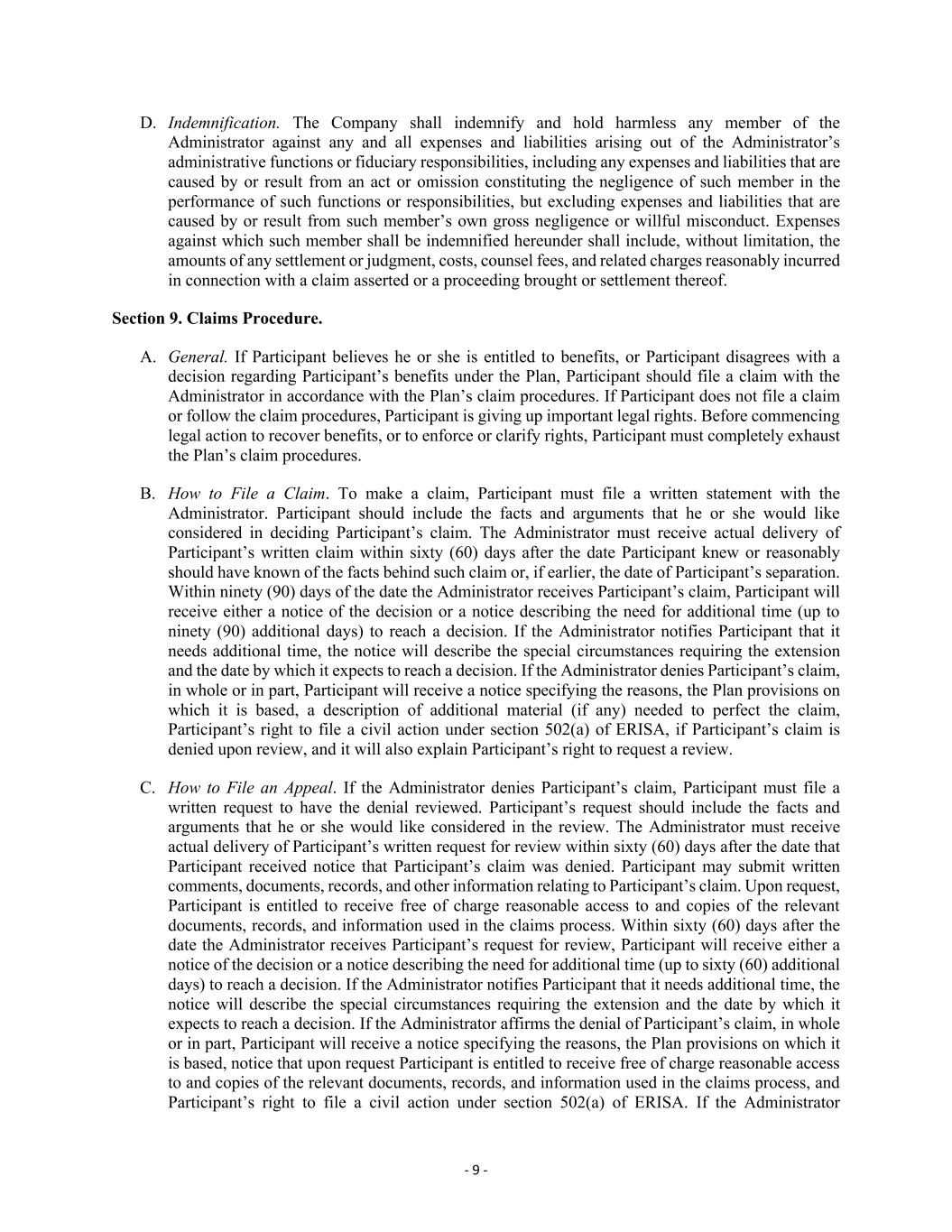 - 9 - D. Indemnification. The Company shall indemnify and hold harmless any member of the Administrator against any and all expenses and liabilities arising out of the Administrator’s administrative functions or fiduciary responsibilities, including any expenses and liabilities that are caused by or result from an act or omission constituting the negligence of such member in the performance of such functions or responsibilities, but excluding expenses and liabilities that are caused by or result from such member’s own gross negligence or willful misconduct. Expenses against which such member shall be indemnified hereunder shall include, without limitation, the amounts of any settlement or judgment, costs, counsel fees, and related charges reasonably incurred in connection with a claim asserted or a proceeding brought or settlement thereof. Section 9. Claims Procedure. A. General. If Participant believes he or she is entitled to benefits, or Participant disagrees with a decision regarding Participant’s benefits under the Plan, Participant should file a claim with the Administrator in accordance with the Plan’s claim procedures. If Participant does not file a claim or follow the claim procedures, Participant is giving up important legal rights. Before commencing legal action to recover benefits, or to enforce or clarify rights, Participant must completely exhaust the Plan’s claim procedures. B. How to File a Claim. To make a claim, Participant must file a written statement with the Administrator. Participant should include the facts and arguments that he or she would like considered in deciding Participant’s claim. The Administrator must receive actual delivery of Participant’s written claim within sixty (60) days after the date Participant knew or reasonably should have known of the facts behind such claim or, if earlier, the date of Participant’s separation. Within ninety (90) days of the date the Administrator receives Participant’s claim, Participant will receive either a notice of the decision or a notice describing the need for additional time (up to ninety (90) additional days) to reach a decision. If the Administrator notifies Participant that it needs additional time, the notice will describe the special circumstances requiring the extension and the date by which it expects to reach a decision. If the Administrator denies Participant’s claim, in whole or in part, Participant will receive a notice specifying the reasons, the Plan provisions on which it is based, a description of additional material (if any) needed to perfect the claim, Participant’s right to file a civil action under section 502(a) of ERISA, if Participant’s claim is denied upon review, and it will also explain Participant’s right to request a review. C. How to File an Appeal. If the Administrator denies Participant’s claim, Participant must file a written request to have the denial reviewed. Participant’s request should include the facts and arguments that he or she would like considered in the review. The Administrator must receive actual delivery of Participant’s written request for review within sixty (60) days after the date that Participant received notice that Participant’s claim was denied. Participant may submit written comments, documents, records, and other information relating to Participant’s claim. Upon request, Participant is entitled to receive free of charge reasonable access to and copies of the relevant documents, records, and information used in the claims process. Within sixty (60) days after the date the Administrator receives Participant’s request for review, Participant will receive either a notice of the decision or a notice describing the need for additional time (up to sixty (60) additional days) to reach a decision. If the Administrator notifies Participant that it needs additional time, the notice will describe the special circumstances requiring the extension and the date by which it expects to reach a decision. If the Administrator affirms the denial of Participant’s claim, in whole or in part, Participant will receive a notice specifying the reasons, the Plan provisions on which it is based, notice that upon request Participant is entitled to receive free of charge reasonable access to and copies of the relevant documents, records, and information used in the claims process, and Participant’s right to file a civil action under section 502(a) of ERISA. If the Administrator