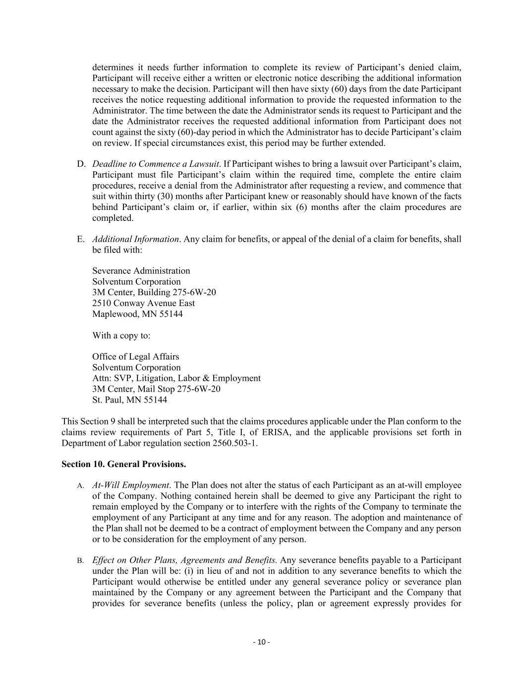 - 10 - determines it needs further information to complete its review of Participant’s denied claim, Participant will receive either a written or electronic notice describing the additional information necessary to make the decision. Participant will then have sixty (60) days from the date Participant receives the notice requesting additional information to provide the requested information to the Administrator. The time between the date the Administrator sends its request to Participant and the date the Administrator receives the requested additional information from Participant does not count against the sixty (60)-day period in which the Administrator has to decide Participant’s claim on review. If special circumstances exist, this period may be further extended. D. Deadline to Commence a Lawsuit. If Participant wishes to bring a lawsuit over Participant’s claim, Participant must file Participant’s claim within the required time, complete the entire claim procedures, receive a denial from the Administrator after requesting a review, and commence that suit within thirty (30) months after Participant knew or reasonably should have known of the facts behind Participant’s claim or, if earlier, within six (6) months after the claim procedures are completed. E. Additional Information. Any claim for benefits, or appeal of the denial of a claim for benefits, shall be filed with: Severance Administration Solventum Corporation 3M Center, Building 275-6W-20 2510 Conway Avenue East Maplewood, MN 55144 With a copy to: Office of Legal Affairs Solventum Corporation Attn: SVP, Litigation, Labor & Employment 3M Center, Mail Stop 275-6W-20 St. Paul, MN 55144 This Section 9 shall be interpreted such that the claims procedures applicable under the Plan conform to the claims review requirements of Part 5, Title I, of ERISA, and the applicable provisions set forth in Department of Labor regulation section 2560.503-1. Section 10. General Provisions. A. At-Will Employment. The Plan does not alter the status of each Participant as an at-will employee of the Company. Nothing contained herein shall be deemed to give any Participant the right to remain employed by the Company or to interfere with the rights of the Company to terminate the employment of any Participant at any time and for any reason. The adoption and maintenance of the Plan shall not be deemed to be a contract of employment between the Company and any person or to be consideration for the employment of any person. B. Effect on Other Plans, Agreements and Benefits. Any severance benefits payable to a Participant under the Plan will be: (i) in lieu of and not in addition to any severance benefits to which the Participant would otherwise be entitled under any general severance policy or severance plan maintained by the Company or any agreement between the Participant and the Company that provides for severance benefits (unless the policy, plan or agreement expressly provides for