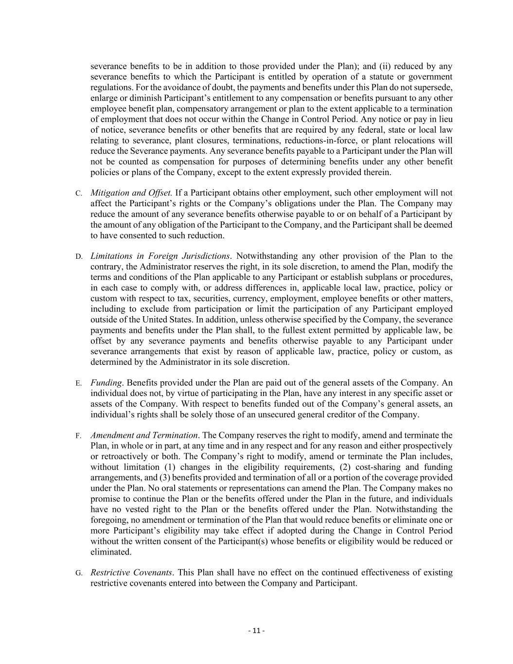 - 11 - severance benefits to be in addition to those provided under the Plan); and (ii) reduced by any severance benefits to which the Participant is entitled by operation of a statute or government regulations. For the avoidance of doubt, the payments and benefits under this Plan do not supersede, enlarge or diminish Participant’s entitlement to any compensation or benefits pursuant to any other employee benefit plan, compensatory arrangement or plan to the extent applicable to a termination of employment that does not occur within the Change in Control Period. Any notice or pay in lieu of notice, severance benefits or other benefits that are required by any federal, state or local law relating to severance, plant closures, terminations, reductions-in-force, or plant relocations will reduce the Severance payments. Any severance benefits payable to a Participant under the Plan will not be counted as compensation for purposes of determining benefits under any other benefit policies or plans of the Company, except to the extent expressly provided therein. C. Mitigation and Offset. If a Participant obtains other employment, such other employment will not affect the Participant’s rights or the Company’s obligations under the Plan. The Company may reduce the amount of any severance benefits otherwise payable to or on behalf of a Participant by the amount of any obligation of the Participant to the Company, and the Participant shall be deemed to have consented to such reduction. D. Limitations in Foreign Jurisdictions. Notwithstanding any other provision of the Plan to the contrary, the Administrator reserves the right, in its sole discretion, to amend the Plan, modify the terms and conditions of the Plan applicable to any Participant or establish subplans or procedures, in each case to comply with, or address differences in, applicable local law, practice, policy or custom with respect to tax, securities, currency, employment, employee benefits or other matters, including to exclude from participation or limit the participation of any Participant employed outside of the United States. In addition, unless otherwise specified by the Company, the severance payments and benefits under the Plan shall, to the fullest extent permitted by applicable law, be offset by any severance payments and benefits otherwise payable to any Participant under severance arrangements that exist by reason of applicable law, practice, policy or custom, as determined by the Administrator in its sole discretion. E. Funding. Benefits provided under the Plan are paid out of the general assets of the Company. An individual does not, by virtue of participating in the Plan, have any interest in any specific asset or assets of the Company. With respect to benefits funded out of the Company’s general assets, an individual’s rights shall be solely those of an unsecured general creditor of the Company. F. Amendment and Termination. The Company reserves the right to modify, amend and terminate the Plan, in whole or in part, at any time and in any respect and for any reason and either prospectively or retroactively or both. The Company’s right to modify, amend or terminate the Plan includes, without limitation (1) changes in the eligibility requirements, (2) cost-sharing and funding arrangements, and (3) benefits provided and termination of all or a portion of the coverage provided under the Plan. No oral statements or representations can amend the Plan. The Company makes no promise to continue the Plan or the benefits offered under the Plan in the future, and individuals have no vested right to the Plan or the benefits offered under the Plan. Notwithstanding the foregoing, no amendment or termination of the Plan that would reduce benefits or eliminate one or more Participant’s eligibility may take effect if adopted during the Change in Control Period without the written consent of the Participant(s) whose benefits or eligibility would be reduced or eliminated. G. Restrictive Covenants. This Plan shall have no effect on the continued effectiveness of existing restrictive covenants entered into between the Company and Participant.