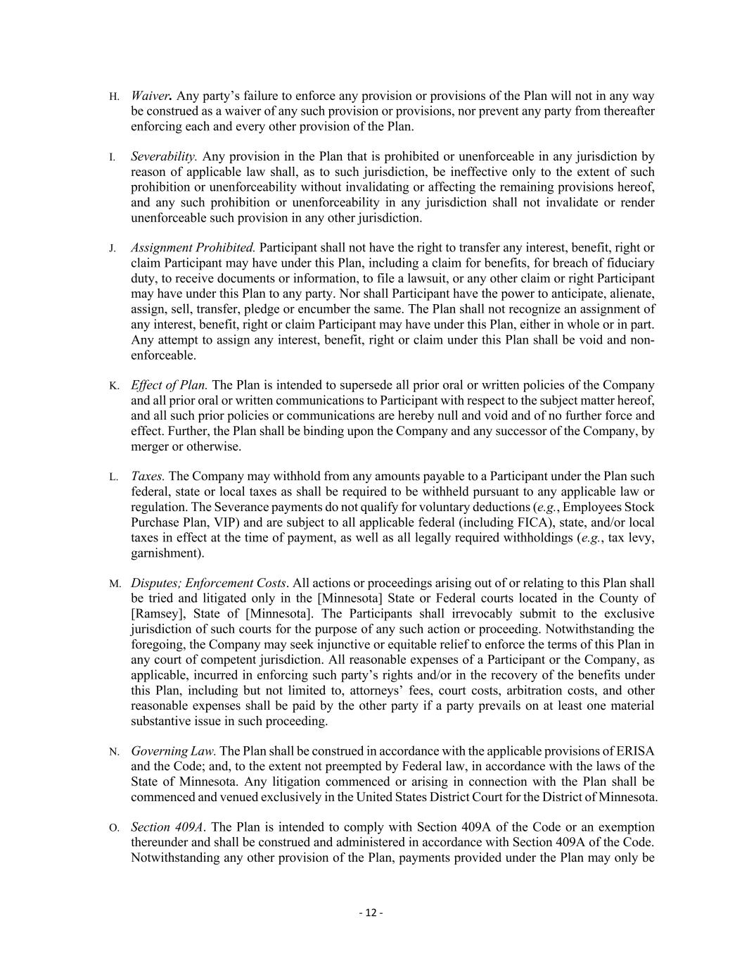 - 12 - H. Waiver. Any party’s failure to enforce any provision or provisions of the Plan will not in any way be construed as a waiver of any such provision or provisions, nor prevent any party from thereafter enforcing each and every other provision of the Plan. I. Severability. Any provision in the Plan that is prohibited or unenforceable in any jurisdiction by reason of applicable law shall, as to such jurisdiction, be ineffective only to the extent of such prohibition or unenforceability without invalidating or affecting the remaining provisions hereof, and any such prohibition or unenforceability in any jurisdiction shall not invalidate or render unenforceable such provision in any other jurisdiction. J. Assignment Prohibited. Participant shall not have the right to transfer any interest, benefit, right or claim Participant may have under this Plan, including a claim for benefits, for breach of fiduciary duty, to receive documents or information, to file a lawsuit, or any other claim or right Participant may have under this Plan to any party. Nor shall Participant have the power to anticipate, alienate, assign, sell, transfer, pledge or encumber the same. The Plan shall not recognize an assignment of any interest, benefit, right or claim Participant may have under this Plan, either in whole or in part. Any attempt to assign any interest, benefit, right or claim under this Plan shall be void and non- enforceable. K. Effect of Plan. The Plan is intended to supersede all prior oral or written policies of the Company and all prior oral or written communications to Participant with respect to the subject matter hereof, and all such prior policies or communications are hereby null and void and of no further force and effect. Further, the Plan shall be binding upon the Company and any successor of the Company, by merger or otherwise. L. Taxes. The Company may withhold from any amounts payable to a Participant under the Plan such federal, state or local taxes as shall be required to be withheld pursuant to any applicable law or regulation. The Severance payments do not qualify for voluntary deductions (e.g., Employees Stock Purchase Plan, VIP) and are subject to all applicable federal (including FICA), state, and/or local taxes in effect at the time of payment, as well as all legally required withholdings (e.g., tax levy, garnishment). M. Disputes; Enforcement Costs. All actions or proceedings arising out of or relating to this Plan shall be tried and litigated only in the [Minnesota] State or Federal courts located in the County of [Ramsey], State of [Minnesota]. The Participants shall irrevocably submit to the exclusive jurisdiction of such courts for the purpose of any such action or proceeding. Notwithstanding the foregoing, the Company may seek injunctive or equitable relief to enforce the terms of this Plan in any court of competent jurisdiction. All reasonable expenses of a Participant or the Company, as applicable, incurred in enforcing such party’s rights and/or in the recovery of the benefits under this Plan, including but not limited to, attorneys’ fees, court costs, arbitration costs, and other reasonable expenses shall be paid by the other party if a party prevails on at least one material substantive issue in such proceeding. N. Governing Law. The Plan shall be construed in accordance with the applicable provisions of ERISA and the Code; and, to the extent not preempted by Federal law, in accordance with the laws of the State of Minnesota. Any litigation commenced or arising in connection with the Plan shall be commenced and venued exclusively in the United States District Court for the District of Minnesota. O. Section 409A. The Plan is intended to comply with Section 409A of the Code or an exemption thereunder and shall be construed and administered in accordance with Section 409A of the Code. Notwithstanding any other provision of the Plan, payments provided under the Plan may only be