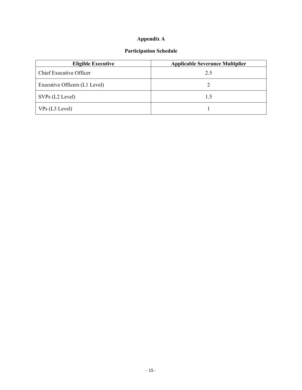 - 15 - Appendix A Participation Schedule Eligible Executive Applicable Severance Multiplier Chief Executive Officer 2.5 Executive Officers (L1 Level) 2 SVPs (L2 Level) 1.5 VPs (L3 Level) 1