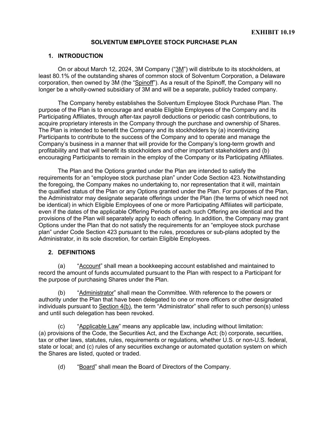 SOLVENTUM EMPLOYEE STOCK PURCHASE PLAN 1. INTRODUCTION On or about March 12, 2024, 3M Company (“3M”) will distribute to its stockholders, at least 80.1% of the outstanding shares of common stock of Solventum Corporation, a Delaware corporation, then owned by 3M (the “Spinoff”). As a result of the Spinoff, the Company will no longer be a wholly-owned subsidiary of 3M and will be a separate, publicly traded company. The Company hereby establishes the Solventum Employee Stock Purchase Plan. The purpose of the Plan is to encourage and enable Eligible Employees of the Company and its Participating Affiliates, through after-tax payroll deductions or periodic cash contributions, to acquire proprietary interests in the Company through the purchase and ownership of Shares. The Plan is intended to benefit the Company and its stockholders by (a) incentivizing Participants to contribute to the success of the Company and to operate and manage the Company’s business in a manner that will provide for the Company’s long-term growth and profitability and that will benefit its stockholders and other important stakeholders and (b) encouraging Participants to remain in the employ of the Company or its Participating Affiliates. The Plan and the Options granted under the Plan are intended to satisfy the requirements for an “employee stock purchase plan” under Code Section 423. Notwithstanding the foregoing, the Company makes no undertaking to, nor representation that it will, maintain the qualified status of the Plan or any Options granted under the Plan. For purposes of the Plan, the Administrator may designate separate offerings under the Plan (the terms of which need not be identical) in which Eligible Employees of one or more Participating Affiliates will participate, even if the dates of the applicable Offering Periods of each such Offering are identical and the provisions of the Plan will separately apply to each offering. In addition, the Company may grant Options under the Plan that do not satisfy the requirements for an “employee stock purchase plan” under Code Section 423 pursuant to the rules, procedures or sub-plans adopted by the Administrator, in its sole discretion, for certain Eligible Employees. 2. DEFINITIONS (a) “Account” shall mean a bookkeeping account established and maintained to record the amount of funds accumulated pursuant to the Plan with respect to a Participant for the purpose of purchasing Shares under the Plan. (b) “Administrator” shall mean the Committee. With reference to the powers or authority under the Plan that have been delegated to one or more officers or other designated individuals pursuant to Section 4(b), the term “Administrator” shall refer to such person(s) unless and until such delegation has been revoked. (c) “Applicable Law” means any applicable law, including without limitation: (a) provisions of the Code, the Securities Act, and the Exchange Act; (b) corporate, securities, tax or other laws, statutes, rules, requirements or regulations, whether U.S. or non-U.S. federal, state or local; and (c) rules of any securities exchange or automated quotation system on which the Shares are listed, quoted or traded. (d) “Board” shall mean the Board of Directors of the Company. EXHIBIT 10.19