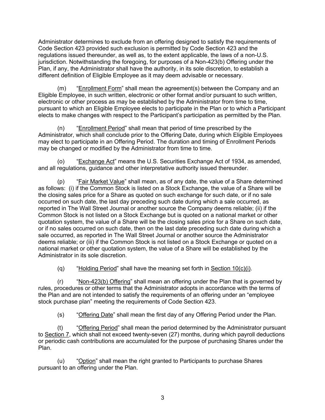 3 Administrator determines to exclude from an offering designed to satisfy the requirements of Code Section 423 provided such exclusion is permitted by Code Section 423 and the regulations issued thereunder, as well as, to the extent applicable, the laws of a non-U.S. jurisdiction. Notwithstanding the foregoing, for purposes of a Non-423(b) Offering under the Plan, if any, the Administrator shall have the authority, in its sole discretion, to establish a different definition of Eligible Employee as it may deem advisable or necessary. (m) “Enrollment Form” shall mean the agreement(s) between the Company and an Eligible Employee, in such written, electronic or other format and/or pursuant to such written, electronic or other process as may be established by the Administrator from time to time, pursuant to which an Eligible Employee elects to participate in the Plan or to which a Participant elects to make changes with respect to the Participant’s participation as permitted by the Plan. (n) “Enrollment Period” shall mean that period of time prescribed by the Administrator, which shall conclude prior to the Offering Date, during which Eligible Employees may elect to participate in an Offering Period. The duration and timing of Enrollment Periods may be changed or modified by the Administrator from time to time. (o) “Exchange Act” means the U.S. Securities Exchange Act of 1934, as amended, and all regulations, guidance and other interpretative authority issued thereunder. (p) “Fair Market Value” shall mean, as of any date, the value of a Share determined as follows: (i) if the Common Stock is listed on a Stock Exchange, the value of a Share will be the closing sales price for a Share as quoted on such exchange for such date, or if no sale occurred on such date, the last day preceding such date during which a sale occurred, as reported in The Wall Street Journal or another source the Company deems reliable; (ii) if the Common Stock is not listed on a Stock Exchange but is quoted on a national market or other quotation system, the value of a Share will be the closing sales price for a Share on such date, or if no sales occurred on such date, then on the last date preceding such date during which a sale occurred, as reported in The Wall Street Journal or another source the Administrator deems reliable; or (iii) if the Common Stock is not listed on a Stock Exchange or quoted on a national market or other quotation system, the value of a Share will be established by the Administrator in its sole discretion. (q) “Holding Period” shall have the meaning set forth in Section 10(c)(i). (r) “Non-423(b) Offering” shall mean an offering under the Plan that is governed by rules, procedures or other terms that the Administrator adopts in accordance with the terms of the Plan and are not intended to satisfy the requirements of an offering under an “employee stock purchase plan” meeting the requirements of Code Section 423. (s) “Offering Date” shall mean the first day of any Offering Period under the Plan. (t) “Offering Period” shall mean the period determined by the Administrator pursuant to Section 7, which shall not exceed twenty-seven (27) months, during which payroll deductions or periodic cash contributions are accumulated for the purpose of purchasing Shares under the Plan. (u) “Option” shall mean the right granted to Participants to purchase Shares pursuant to an offering under the Plan.