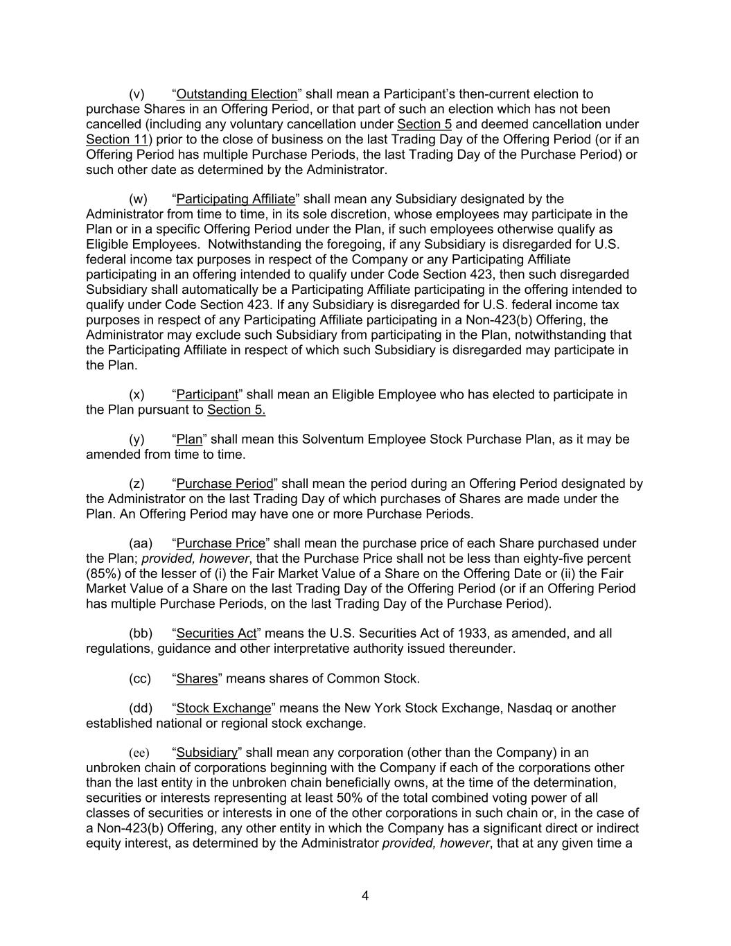 4 (v) “Outstanding Election” shall mean a Participant’s then-current election to purchase Shares in an Offering Period, or that part of such an election which has not been cancelled (including any voluntary cancellation under Section 5 and deemed cancellation under Section 11) prior to the close of business on the last Trading Day of the Offering Period (or if an Offering Period has multiple Purchase Periods, the last Trading Day of the Purchase Period) or such other date as determined by the Administrator. (w) “Participating Affiliate” shall mean any Subsidiary designated by the Administrator from time to time, in its sole discretion, whose employees may participate in the Plan or in a specific Offering Period under the Plan, if such employees otherwise qualify as Eligible Employees. Notwithstanding the foregoing, if any Subsidiary is disregarded for U.S. federal income tax purposes in respect of the Company or any Participating Affiliate participating in an offering intended to qualify under Code Section 423, then such disregarded Subsidiary shall automatically be a Participating Affiliate participating in the offering intended to qualify under Code Section 423. If any Subsidiary is disregarded for U.S. federal income tax purposes in respect of any Participating Affiliate participating in a Non-423(b) Offering, the Administrator may exclude such Subsidiary from participating in the Plan, notwithstanding that the Participating Affiliate in respect of which such Subsidiary is disregarded may participate in the Plan. (x) “Participant” shall mean an Eligible Employee who has elected to participate in the Plan pursuant to Section 5. (y) “Plan” shall mean this Solventum Employee Stock Purchase Plan, as it may be amended from time to time. (z) “Purchase Period” shall mean the period during an Offering Period designated by the Administrator on the last Trading Day of which purchases of Shares are made under the Plan. An Offering Period may have one or more Purchase Periods. (aa) “Purchase Price” shall mean the purchase price of each Share purchased under the Plan; provided, however, that the Purchase Price shall not be less than eighty-five percent (85%) of the lesser of (i) the Fair Market Value of a Share on the Offering Date or (ii) the Fair Market Value of a Share on the last Trading Day of the Offering Period (or if an Offering Period has multiple Purchase Periods, on the last Trading Day of the Purchase Period). (bb) “Securities Act” means the U.S. Securities Act of 1933, as amended, and all regulations, guidance and other interpretative authority issued thereunder. (cc) “Shares” means shares of Common Stock. (dd) “Stock Exchange” means the New York Stock Exchange, Nasdaq or another established national or regional stock exchange. (ee) “Subsidiary” shall mean any corporation (other than the Company) in an unbroken chain of corporations beginning with the Company if each of the corporations other than the last entity in the unbroken chain beneficially owns, at the time of the determination, securities or interests representing at least 50% of the total combined voting power of all classes of securities or interests in one of the other corporations in such chain or, in the case of a Non-423(b) Offering, any other entity in which the Company has a significant direct or indirect equity interest, as determined by the Administrator provided, however, that at any given time a