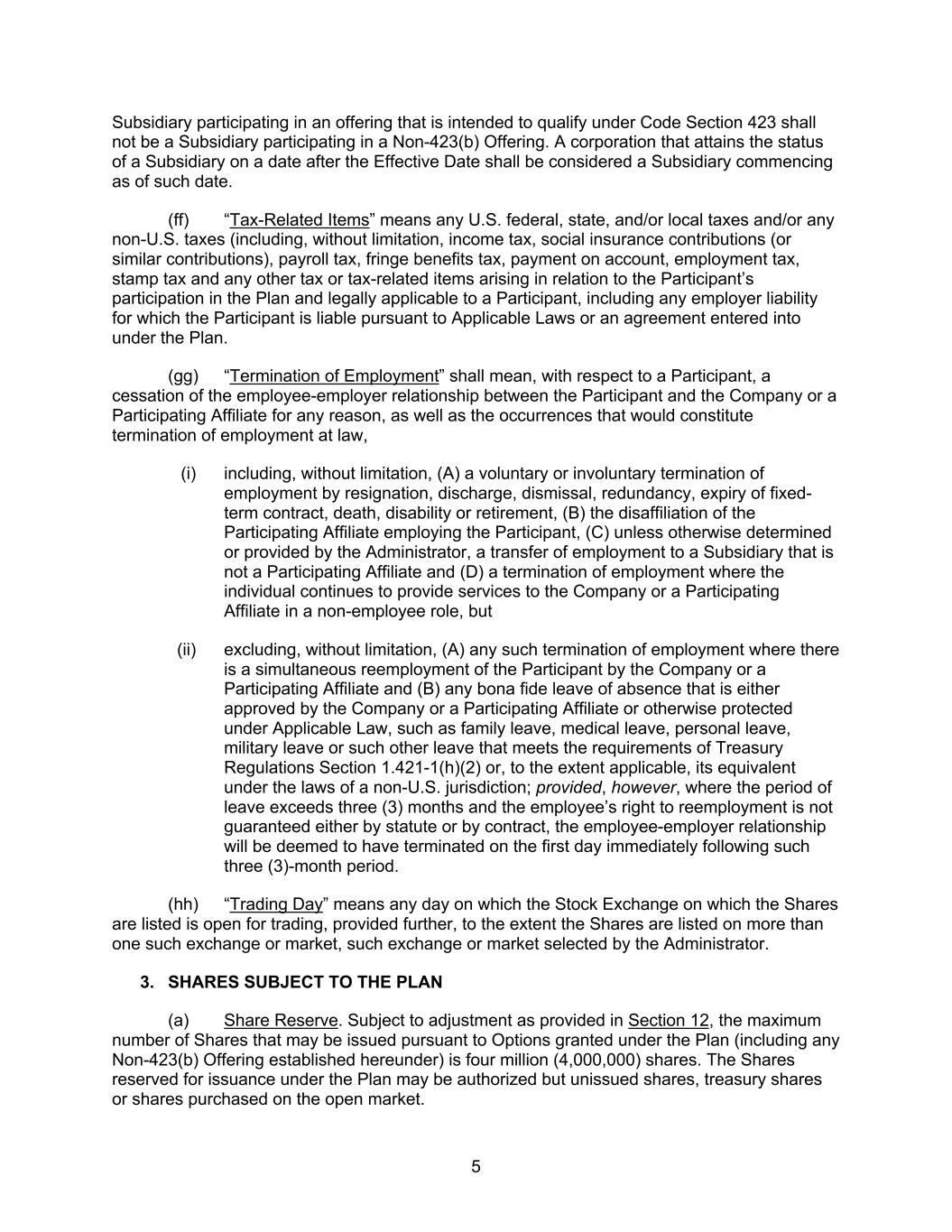 5 Subsidiary participating in an offering that is intended to qualify under Code Section 423 shall not be a Subsidiary participating in a Non-423(b) Offering. A corporation that attains the status of a Subsidiary on a date after the Effective Date shall be considered a Subsidiary commencing as of such date. (ff) “Tax-Related Items” means any U.S. federal, state, and/or local taxes and/or any non-U.S. taxes (including, without limitation, income tax, social insurance contributions (or similar contributions), payroll tax, fringe benefits tax, payment on account, employment tax, stamp tax and any other tax or tax-related items arising in relation to the Participant’s participation in the Plan and legally applicable to a Participant, including any employer liability for which the Participant is liable pursuant to Applicable Laws or an agreement entered into under the Plan. (gg) “Termination of Employment” shall mean, with respect to a Participant, a cessation of the employee-employer relationship between the Participant and the Company or a Participating Affiliate for any reason, as well as the occurrences that would constitute termination of employment at law, (i) including, without limitation, (A) a voluntary or involuntary termination of employment by resignation, discharge, dismissal, redundancy, expiry of fixed- term contract, death, disability or retirement, (B) the disaffiliation of the Participating Affiliate employing the Participant, (C) unless otherwise determined or provided by the Administrator, a transfer of employment to a Subsidiary that is not a Participating Affiliate and (D) a termination of employment where the individual continues to provide services to the Company or a Participating Affiliate in a non-employee role, but (ii) excluding, without limitation, (A) any such termination of employment where there is a simultaneous reemployment of the Participant by the Company or a Participating Affiliate and (B) any bona fide leave of absence that is either approved by the Company or a Participating Affiliate or otherwise protected under Applicable Law, such as family leave, medical leave, personal leave, military leave or such other leave that meets the requirements of Treasury Regulations Section 1.421-1(h)(2) or, to the extent applicable, its equivalent under the laws of a non-U.S. jurisdiction; provided, however, where the period of leave exceeds three (3) months and the employee’s right to reemployment is not guaranteed either by statute or by contract, the employee-employer relationship will be deemed to have terminated on the first day immediately following such three (3)-month period. (hh) “Trading Day” means any day on which the Stock Exchange on which the Shares are listed is open for trading, provided further, to the extent the Shares are listed on more than one such exchange or market, such exchange or market selected by the Administrator. 3. SHARES SUBJECT TO THE PLAN (a) Share Reserve. Subject to adjustment as provided in Section 12, the maximum number of Shares that may be issued pursuant to Options granted under the Plan (including any Non-423(b) Offering established hereunder) is four million (4,000,000) shares. The Shares reserved for issuance under the Plan may be authorized but unissued shares, treasury shares or shares purchased on the open market.