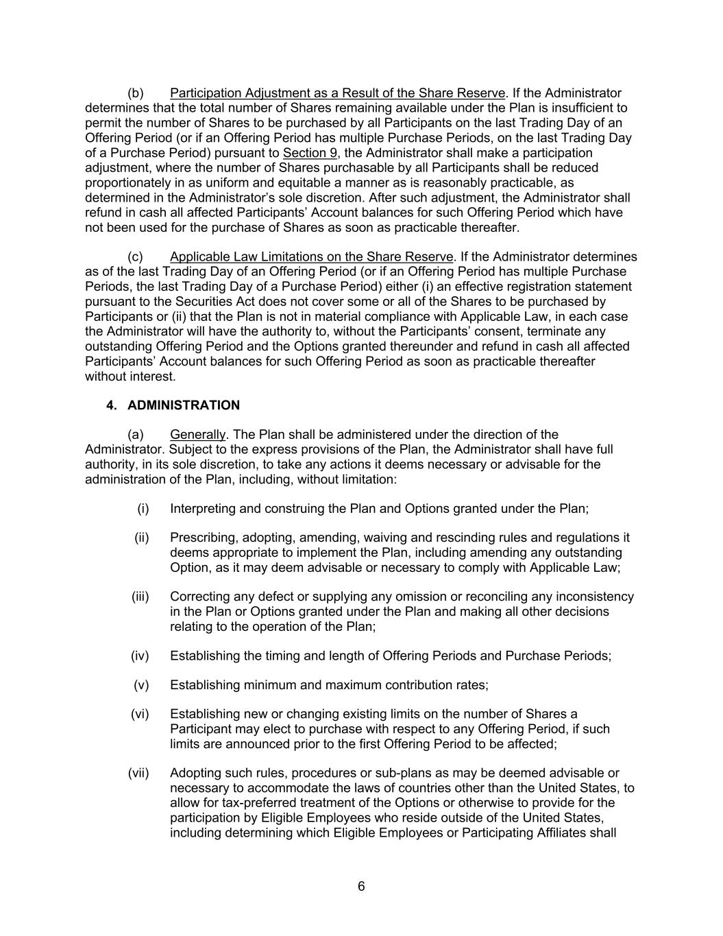 6 (b) Participation Adjustment as a Result of the Share Reserve. If the Administrator determines that the total number of Shares remaining available under the Plan is insufficient to permit the number of Shares to be purchased by all Participants on the last Trading Day of an Offering Period (or if an Offering Period has multiple Purchase Periods, on the last Trading Day of a Purchase Period) pursuant to Section 9, the Administrator shall make a participation adjustment, where the number of Shares purchasable by all Participants shall be reduced proportionately in as uniform and equitable a manner as is reasonably practicable, as determined in the Administrator’s sole discretion. After such adjustment, the Administrator shall refund in cash all affected Participants’ Account balances for such Offering Period which have not been used for the purchase of Shares as soon as practicable thereafter. (c) Applicable Law Limitations on the Share Reserve. If the Administrator determines as of the last Trading Day of an Offering Period (or if an Offering Period has multiple Purchase Periods, the last Trading Day of a Purchase Period) either (i) an effective registration statement pursuant to the Securities Act does not cover some or all of the Shares to be purchased by Participants or (ii) that the Plan is not in material compliance with Applicable Law, in each case the Administrator will have the authority to, without the Participants’ consent, terminate any outstanding Offering Period and the Options granted thereunder and refund in cash all affected Participants’ Account balances for such Offering Period as soon as practicable thereafter without interest. 4. ADMINISTRATION (a) Generally. The Plan shall be administered under the direction of the Administrator. Subject to the express provisions of the Plan, the Administrator shall have full authority, in its sole discretion, to take any actions it deems necessary or advisable for the administration of the Plan, including, without limitation: (i) Interpreting and construing the Plan and Options granted under the Plan; (ii) Prescribing, adopting, amending, waiving and rescinding rules and regulations it deems appropriate to implement the Plan, including amending any outstanding Option, as it may deem advisable or necessary to comply with Applicable Law; (iii) Correcting any defect or supplying any omission or reconciling any inconsistency in the Plan or Options granted under the Plan and making all other decisions relating to the operation of the Plan; (iv) Establishing the timing and length of Offering Periods and Purchase Periods; (v) Establishing minimum and maximum contribution rates; (vi) Establishing new or changing existing limits on the number of Shares a Participant may elect to purchase with respect to any Offering Period, if such limits are announced prior to the first Offering Period to be affected; (vii) Adopting such rules, procedures or sub-plans as may be deemed advisable or necessary to accommodate the laws of countries other than the United States, to allow for tax-preferred treatment of the Options or otherwise to provide for the participation by Eligible Employees who reside outside of the United States, including determining which Eligible Employees or Participating Affiliates shall