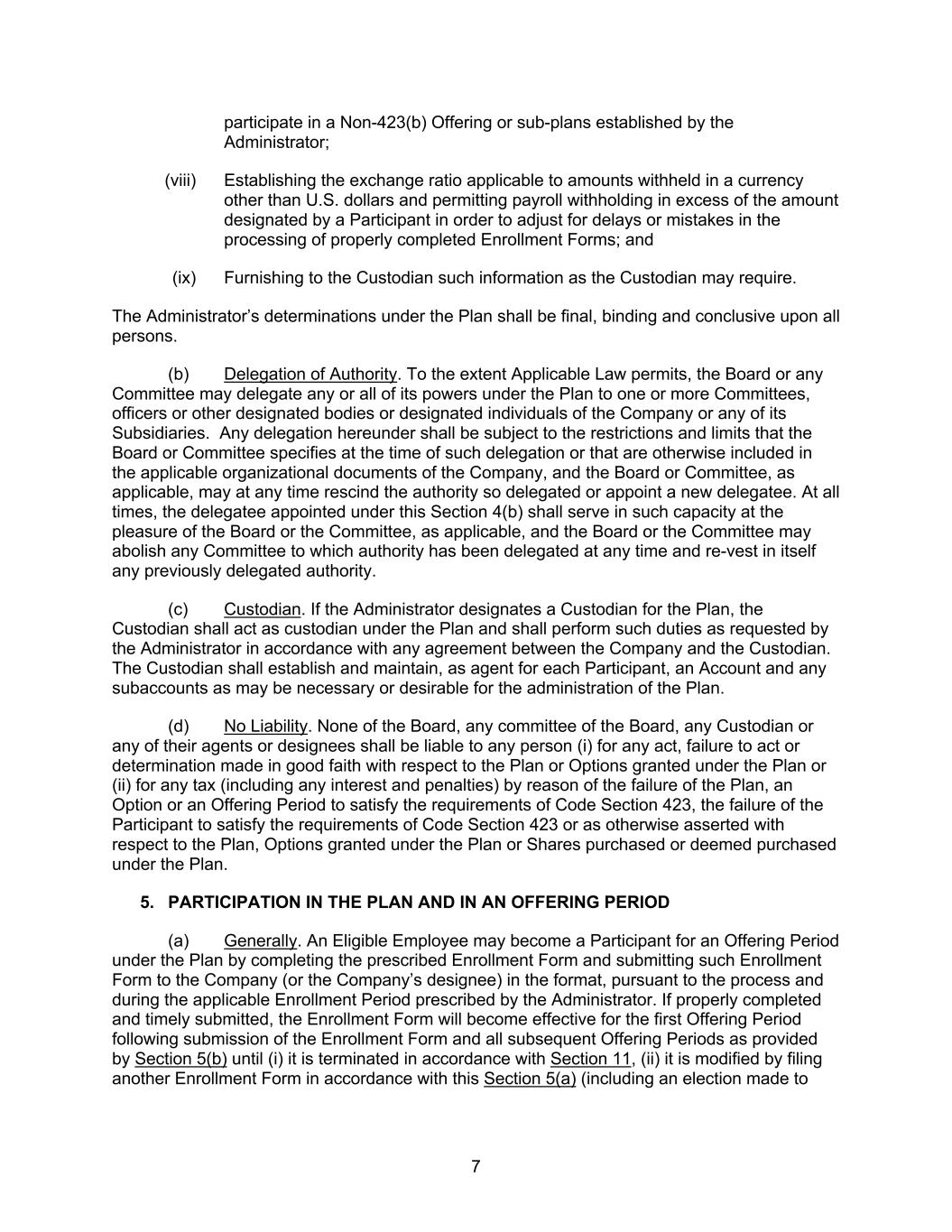 7 participate in a Non-423(b) Offering or sub-plans established by the Administrator; (viii) Establishing the exchange ratio applicable to amounts withheld in a currency other than U.S. dollars and permitting payroll withholding in excess of the amount designated by a Participant in order to adjust for delays or mistakes in the processing of properly completed Enrollment Forms; and (ix) Furnishing to the Custodian such information as the Custodian may require. The Administrator’s determinations under the Plan shall be final, binding and conclusive upon all persons. (b) Delegation of Authority. To the extent Applicable Law permits, the Board or any Committee may delegate any or all of its powers under the Plan to one or more Committees, officers or other designated bodies or designated individuals of the Company or any of its Subsidiaries. Any delegation hereunder shall be subject to the restrictions and limits that the Board or Committee specifies at the time of such delegation or that are otherwise included in the applicable organizational documents of the Company, and the Board or Committee, as applicable, may at any time rescind the authority so delegated or appoint a new delegatee. At all times, the delegatee appointed under this Section 4(b) shall serve in such capacity at the pleasure of the Board or the Committee, as applicable, and the Board or the Committee may abolish any Committee to which authority has been delegated at any time and re-vest in itself any previously delegated authority. (c) Custodian. If the Administrator designates a Custodian for the Plan, the Custodian shall act as custodian under the Plan and shall perform such duties as requested by the Administrator in accordance with any agreement between the Company and the Custodian. The Custodian shall establish and maintain, as agent for each Participant, an Account and any subaccounts as may be necessary or desirable for the administration of the Plan. (d) No Liability. None of the Board, any committee of the Board, any Custodian or any of their agents or designees shall be liable to any person (i) for any act, failure to act or determination made in good faith with respect to the Plan or Options granted under the Plan or (ii) for any tax (including any interest and penalties) by reason of the failure of the Plan, an Option or an Offering Period to satisfy the requirements of Code Section 423, the failure of the Participant to satisfy the requirements of Code Section 423 or as otherwise asserted with respect to the Plan, Options granted under the Plan or Shares purchased or deemed purchased under the Plan. 5. PARTICIPATION IN THE PLAN AND IN AN OFFERING PERIOD (a) Generally. An Eligible Employee may become a Participant for an Offering Period under the Plan by completing the prescribed Enrollment Form and submitting such Enrollment Form to the Company (or the Company’s designee) in the format, pursuant to the process and during the applicable Enrollment Period prescribed by the Administrator. If properly completed and timely submitted, the Enrollment Form will become effective for the first Offering Period following submission of the Enrollment Form and all subsequent Offering Periods as provided by Section 5(b) until (i) it is terminated in accordance with Section 11, (ii) it is modified by filing another Enrollment Form in accordance with this Section 5(a) (including an election made to