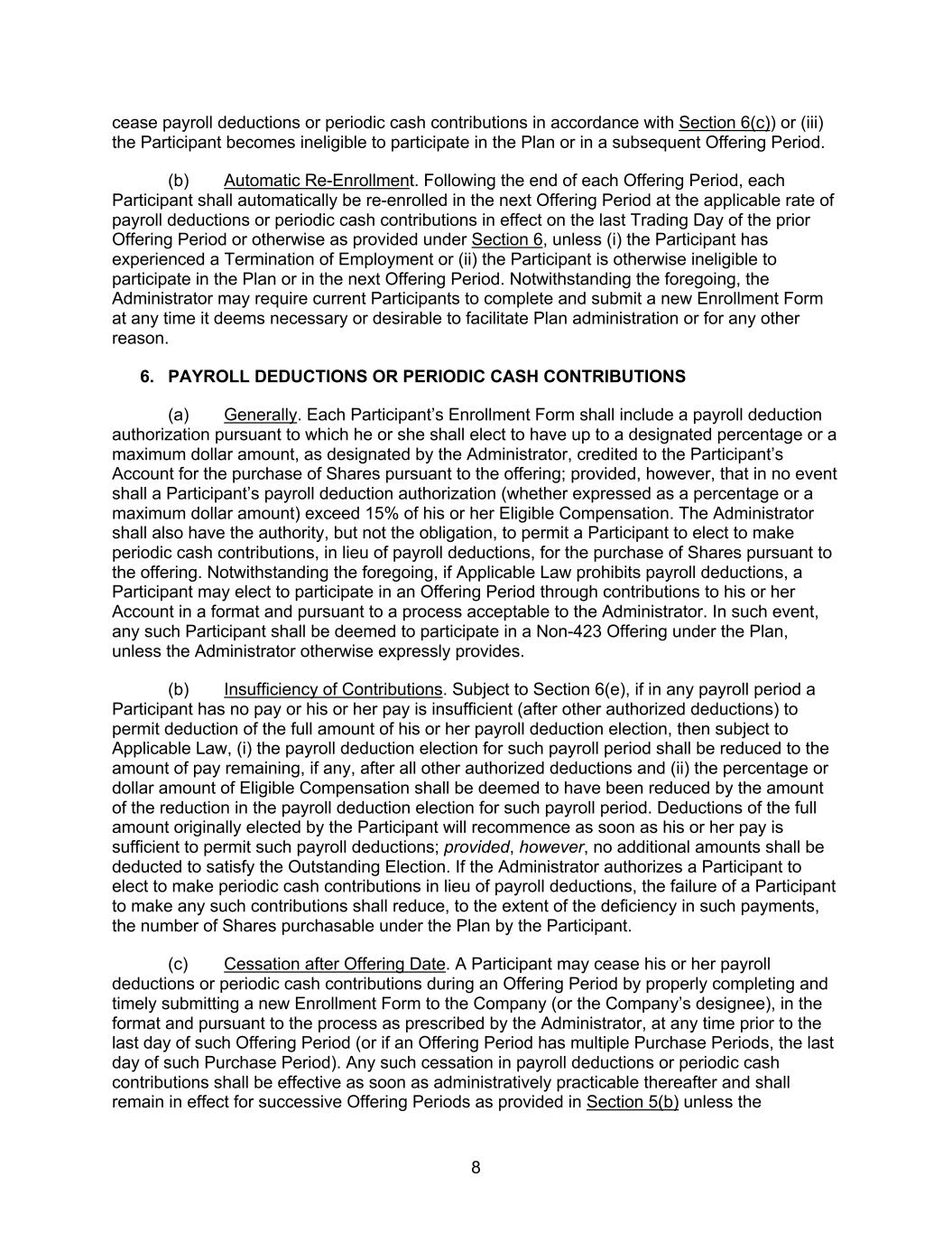 8 cease payroll deductions or periodic cash contributions in accordance with Section 6(c)) or (iii) the Participant becomes ineligible to participate in the Plan or in a subsequent Offering Period. (b) Automatic Re-Enrollment. Following the end of each Offering Period, each Participant shall automatically be re-enrolled in the next Offering Period at the applicable rate of payroll deductions or periodic cash contributions in effect on the last Trading Day of the prior Offering Period or otherwise as provided under Section 6, unless (i) the Participant has experienced a Termination of Employment or (ii) the Participant is otherwise ineligible to participate in the Plan or in the next Offering Period. Notwithstanding the foregoing, the Administrator may require current Participants to complete and submit a new Enrollment Form at any time it deems necessary or desirable to facilitate Plan administration or for any other reason. 6. PAYROLL DEDUCTIONS OR PERIODIC CASH CONTRIBUTIONS (a) Generally. Each Participant’s Enrollment Form shall include a payroll deduction authorization pursuant to which he or she shall elect to have up to a designated percentage or a maximum dollar amount, as designated by the Administrator, credited to the Participant’s Account for the purchase of Shares pursuant to the offering; provided, however, that in no event shall a Participant’s payroll deduction authorization (whether expressed as a percentage or a maximum dollar amount) exceed 15% of his or her Eligible Compensation. The Administrator shall also have the authority, but not the obligation, to permit a Participant to elect to make periodic cash contributions, in lieu of payroll deductions, for the purchase of Shares pursuant to the offering. Notwithstanding the foregoing, if Applicable Law prohibits payroll deductions, a Participant may elect to participate in an Offering Period through contributions to his or her Account in a format and pursuant to a process acceptable to the Administrator. In such event, any such Participant shall be deemed to participate in a Non-423 Offering under the Plan, unless the Administrator otherwise expressly provides. (b) Insufficiency of Contributions. Subject to Section 6(e), if in any payroll period a Participant has no pay or his or her pay is insufficient (after other authorized deductions) to permit deduction of the full amount of his or her payroll deduction election, then subject to Applicable Law, (i) the payroll deduction election for such payroll period shall be reduced to the amount of pay remaining, if any, after all other authorized deductions and (ii) the percentage or dollar amount of Eligible Compensation shall be deemed to have been reduced by the amount of the reduction in the payroll deduction election for such payroll period. Deductions of the full amount originally elected by the Participant will recommence as soon as his or her pay is sufficient to permit such payroll deductions; provided, however, no additional amounts shall be deducted to satisfy the Outstanding Election. If the Administrator authorizes a Participant to elect to make periodic cash contributions in lieu of payroll deductions, the failure of a Participant to make any such contributions shall reduce, to the extent of the deficiency in such payments, the number of Shares purchasable under the Plan by the Participant. (c) Cessation after Offering Date. A Participant may cease his or her payroll deductions or periodic cash contributions during an Offering Period by properly completing and timely submitting a new Enrollment Form to the Company (or the Company’s designee), in the format and pursuant to the process as prescribed by the Administrator, at any time prior to the last day of such Offering Period (or if an Offering Period has multiple Purchase Periods, the last day of such Purchase Period). Any such cessation in payroll deductions or periodic cash contributions shall be effective as soon as administratively practicable thereafter and shall remain in effect for successive Offering Periods as provided in Section 5(b) unless the
