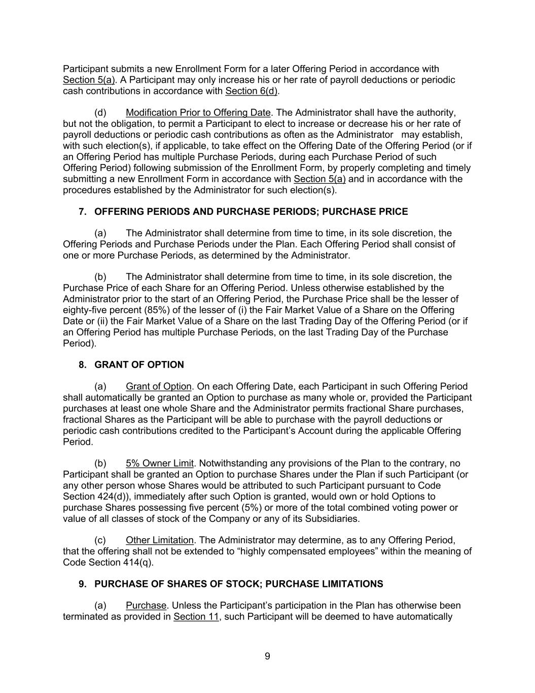 9 Participant submits a new Enrollment Form for a later Offering Period in accordance with Section 5(a). A Participant may only increase his or her rate of payroll deductions or periodic cash contributions in accordance with Section 6(d). (d) Modification Prior to Offering Date. The Administrator shall have the authority, but not the obligation, to permit a Participant to elect to increase or decrease his or her rate of payroll deductions or periodic cash contributions as often as the Administrator may establish, with such election(s), if applicable, to take effect on the Offering Date of the Offering Period (or if an Offering Period has multiple Purchase Periods, during each Purchase Period of such Offering Period) following submission of the Enrollment Form, by properly completing and timely submitting a new Enrollment Form in accordance with Section 5(a) and in accordance with the procedures established by the Administrator for such election(s). 7. OFFERING PERIODS AND PURCHASE PERIODS; PURCHASE PRICE (a) The Administrator shall determine from time to time, in its sole discretion, the Offering Periods and Purchase Periods under the Plan. Each Offering Period shall consist of one or more Purchase Periods, as determined by the Administrator. (b) The Administrator shall determine from time to time, in its sole discretion, the Purchase Price of each Share for an Offering Period. Unless otherwise established by the Administrator prior to the start of an Offering Period, the Purchase Price shall be the lesser of eighty-five percent (85%) of the lesser of (i) the Fair Market Value of a Share on the Offering Date or (ii) the Fair Market Value of a Share on the last Trading Day of the Offering Period (or if an Offering Period has multiple Purchase Periods, on the last Trading Day of the Purchase Period). 8. GRANT OF OPTION (a) Grant of Option. On each Offering Date, each Participant in such Offering Period shall automatically be granted an Option to purchase as many whole or, provided the Participant purchases at least one whole Share and the Administrator permits fractional Share purchases, fractional Shares as the Participant will be able to purchase with the payroll deductions or periodic cash contributions credited to the Participant’s Account during the applicable Offering Period. (b) 5% Owner Limit. Notwithstanding any provisions of the Plan to the contrary, no Participant shall be granted an Option to purchase Shares under the Plan if such Participant (or any other person whose Shares would be attributed to such Participant pursuant to Code Section 424(d)), immediately after such Option is granted, would own or hold Options to purchase Shares possessing five percent (5%) or more of the total combined voting power or value of all classes of stock of the Company or any of its Subsidiaries. (c) Other Limitation. The Administrator may determine, as to any Offering Period, that the offering shall not be extended to “highly compensated employees” within the meaning of Code Section 414(q). 9. PURCHASE OF SHARES OF STOCK; PURCHASE LIMITATIONS (a) Purchase. Unless the Participant’s participation in the Plan has otherwise been terminated as provided in Section 11, such Participant will be deemed to have automatically