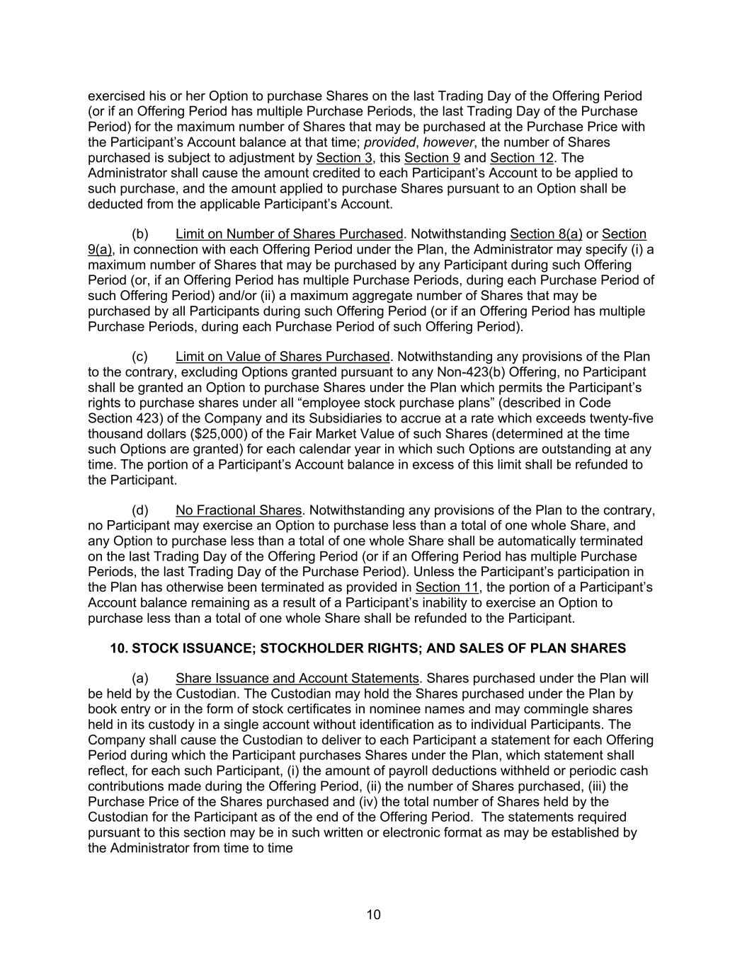 10 exercised his or her Option to purchase Shares on the last Trading Day of the Offering Period (or if an Offering Period has multiple Purchase Periods, the last Trading Day of the Purchase Period) for the maximum number of Shares that may be purchased at the Purchase Price with the Participant’s Account balance at that time; provided, however, the number of Shares purchased is subject to adjustment by Section 3, this Section 9 and Section 12. The Administrator shall cause the amount credited to each Participant’s Account to be applied to such purchase, and the amount applied to purchase Shares pursuant to an Option shall be deducted from the applicable Participant’s Account. (b) Limit on Number of Shares Purchased. Notwithstanding Section 8(a) or Section 9(a), in connection with each Offering Period under the Plan, the Administrator may specify (i) a maximum number of Shares that may be purchased by any Participant during such Offering Period (or, if an Offering Period has multiple Purchase Periods, during each Purchase Period of such Offering Period) and/or (ii) a maximum aggregate number of Shares that may be purchased by all Participants during such Offering Period (or if an Offering Period has multiple Purchase Periods, during each Purchase Period of such Offering Period). (c) Limit on Value of Shares Purchased. Notwithstanding any provisions of the Plan to the contrary, excluding Options granted pursuant to any Non-423(b) Offering, no Participant shall be granted an Option to purchase Shares under the Plan which permits the Participant’s rights to purchase shares under all “employee stock purchase plans” (described in Code Section 423) of the Company and its Subsidiaries to accrue at a rate which exceeds twenty-five thousand dollars ($25,000) of the Fair Market Value of such Shares (determined at the time such Options are granted) for each calendar year in which such Options are outstanding at any time. The portion of a Participant’s Account balance in excess of this limit shall be refunded to the Participant. (d) No Fractional Shares. Notwithstanding any provisions of the Plan to the contrary, no Participant may exercise an Option to purchase less than a total of one whole Share, and any Option to purchase less than a total of one whole Share shall be automatically terminated on the last Trading Day of the Offering Period (or if an Offering Period has multiple Purchase Periods, the last Trading Day of the Purchase Period). Unless the Participant’s participation in the Plan has otherwise been terminated as provided in Section 11, the portion of a Participant’s Account balance remaining as a result of a Participant’s inability to exercise an Option to purchase less than a total of one whole Share shall be refunded to the Participant. 10. STOCK ISSUANCE; STOCKHOLDER RIGHTS; AND SALES OF PLAN SHARES (a) Share Issuance and Account Statements. Shares purchased under the Plan will be held by the Custodian. The Custodian may hold the Shares purchased under the Plan by book entry or in the form of stock certificates in nominee names and may commingle shares held in its custody in a single account without identification as to individual Participants. The Company shall cause the Custodian to deliver to each Participant a statement for each Offering Period during which the Participant purchases Shares under the Plan, which statement shall reflect, for each such Participant, (i) the amount of payroll deductions withheld or periodic cash contributions made during the Offering Period, (ii) the number of Shares purchased, (iii) the Purchase Price of the Shares purchased and (iv) the total number of Shares held by the Custodian for the Participant as of the end of the Offering Period. The statements required pursuant to this section may be in such written or electronic format as may be established by the Administrator from time to time
