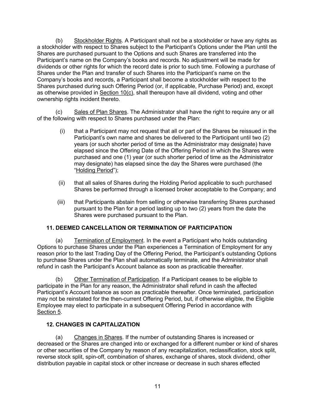 11 (b) Stockholder Rights. A Participant shall not be a stockholder or have any rights as a stockholder with respect to Shares subject to the Participant’s Options under the Plan until the Shares are purchased pursuant to the Options and such Shares are transferred into the Participant’s name on the Company’s books and records. No adjustment will be made for dividends or other rights for which the record date is prior to such time. Following a purchase of Shares under the Plan and transfer of such Shares into the Participant’s name on the Company’s books and records, a Participant shall become a stockholder with respect to the Shares purchased during such Offering Period (or, if applicable, Purchase Period) and, except as otherwise provided in Section 10(c), shall thereupon have all dividend, voting and other ownership rights incident thereto. (c) Sales of Plan Shares. The Administrator shall have the right to require any or all of the following with respect to Shares purchased under the Plan: (i) that a Participant may not request that all or part of the Shares be reissued in the Participant’s own name and shares be delivered to the Participant until two (2) years (or such shorter period of time as the Administrator may designate) have elapsed since the Offering Date of the Offering Period in which the Shares were purchased and one (1) year (or such shorter period of time as the Administrator may designate) has elapsed since the day the Shares were purchased (the “Holding Period”); (ii) that all sales of Shares during the Holding Period applicable to such purchased Shares be performed through a licensed broker acceptable to the Company; and (iii) that Participants abstain from selling or otherwise transferring Shares purchased pursuant to the Plan for a period lasting up to two (2) years from the date the Shares were purchased pursuant to the Plan. 11. DEEMED CANCELLATION OR TERMINATION OF PARTICIPATION (a) Termination of Employment. In the event a Participant who holds outstanding Options to purchase Shares under the Plan experiences a Termination of Employment for any reason prior to the last Trading Day of the Offering Period, the Participant’s outstanding Options to purchase Shares under the Plan shall automatically terminate, and the Administrator shall refund in cash the Participant’s Account balance as soon as practicable thereafter. (b) Other Termination of Participation. If a Participant ceases to be eligible to participate in the Plan for any reason, the Administrator shall refund in cash the affected Participant’s Account balance as soon as practicable thereafter. Once terminated, participation may not be reinstated for the then-current Offering Period, but, if otherwise eligible, the Eligible Employee may elect to participate in a subsequent Offering Period in accordance with Section 5. 12. CHANGES IN CAPITALIZATION (a) Changes in Shares. If the number of outstanding Shares is increased or decreased or the Shares are changed into or exchanged for a different number or kind of shares or other securities of the Company by reason of any recapitalization, reclassification, stock split, reverse stock split, spin-off, combination of shares, exchange of shares, stock dividend, other distribution payable in capital stock or other increase or decrease in such shares effected
