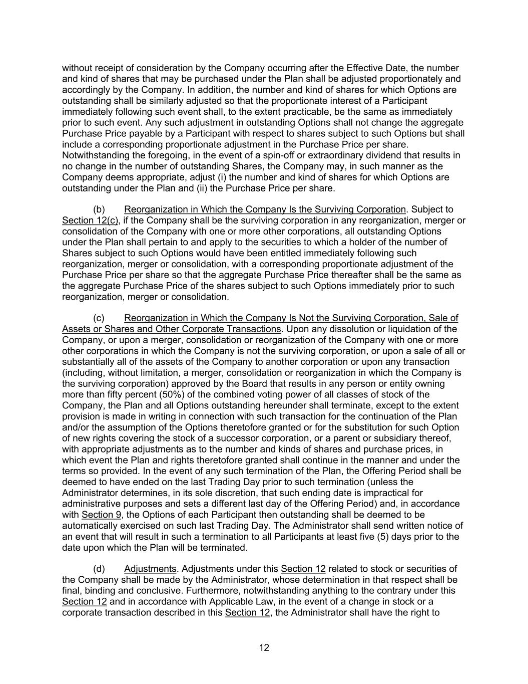 12 without receipt of consideration by the Company occurring after the Effective Date, the number and kind of shares that may be purchased under the Plan shall be adjusted proportionately and accordingly by the Company. In addition, the number and kind of shares for which Options are outstanding shall be similarly adjusted so that the proportionate interest of a Participant immediately following such event shall, to the extent practicable, be the same as immediately prior to such event. Any such adjustment in outstanding Options shall not change the aggregate Purchase Price payable by a Participant with respect to shares subject to such Options but shall include a corresponding proportionate adjustment in the Purchase Price per share. Notwithstanding the foregoing, in the event of a spin-off or extraordinary dividend that results in no change in the number of outstanding Shares, the Company may, in such manner as the Company deems appropriate, adjust (i) the number and kind of shares for which Options are outstanding under the Plan and (ii) the Purchase Price per share. (b) Reorganization in Which the Company Is the Surviving Corporation. Subject to Section 12(c), if the Company shall be the surviving corporation in any reorganization, merger or consolidation of the Company with one or more other corporations, all outstanding Options under the Plan shall pertain to and apply to the securities to which a holder of the number of Shares subject to such Options would have been entitled immediately following such reorganization, merger or consolidation, with a corresponding proportionate adjustment of the Purchase Price per share so that the aggregate Purchase Price thereafter shall be the same as the aggregate Purchase Price of the shares subject to such Options immediately prior to such reorganization, merger or consolidation. (c) Reorganization in Which the Company Is Not the Surviving Corporation, Sale of Assets or Shares and Other Corporate Transactions. Upon any dissolution or liquidation of the Company, or upon a merger, consolidation or reorganization of the Company with one or more other corporations in which the Company is not the surviving corporation, or upon a sale of all or substantially all of the assets of the Company to another corporation or upon any transaction (including, without limitation, a merger, consolidation or reorganization in which the Company is the surviving corporation) approved by the Board that results in any person or entity owning more than fifty percent (50%) of the combined voting power of all classes of stock of the Company, the Plan and all Options outstanding hereunder shall terminate, except to the extent provision is made in writing in connection with such transaction for the continuation of the Plan and/or the assumption of the Options theretofore granted or for the substitution for such Option of new rights covering the stock of a successor corporation, or a parent or subsidiary thereof, with appropriate adjustments as to the number and kinds of shares and purchase prices, in which event the Plan and rights theretofore granted shall continue in the manner and under the terms so provided. In the event of any such termination of the Plan, the Offering Period shall be deemed to have ended on the last Trading Day prior to such termination (unless the Administrator determines, in its sole discretion, that such ending date is impractical for administrative purposes and sets a different last day of the Offering Period) and, in accordance with Section 9, the Options of each Participant then outstanding shall be deemed to be automatically exercised on such last Trading Day. The Administrator shall send written notice of an event that will result in such a termination to all Participants at least five (5) days prior to the date upon which the Plan will be terminated. (d) Adjustments. Adjustments under this Section 12 related to stock or securities of the Company shall be made by the Administrator, whose determination in that respect shall be final, binding and conclusive. Furthermore, notwithstanding anything to the contrary under this Section 12 and in accordance with Applicable Law, in the event of a change in stock or a corporate transaction described in this Section 12, the Administrator shall have the right to