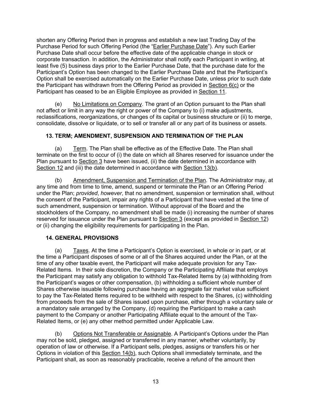 13 shorten any Offering Period then in progress and establish a new last Trading Day of the Purchase Period for such Offering Period (the “Earlier Purchase Date”). Any such Earlier Purchase Date shall occur before the effective date of the applicable change in stock or corporate transaction. In addition, the Administrator shall notify each Participant in writing, at least five (5) business days prior to the Earlier Purchase Date, that the purchase date for the Participant’s Option has been changed to the Earlier Purchase Date and that the Participant’s Option shall be exercised automatically on the Earlier Purchase Date, unless prior to such date the Participant has withdrawn from the Offering Period as provided in Section 6(c) or the Participant has ceased to be an Eligible Employee as provided in Section 11. (e) No Limitations on Company. The grant of an Option pursuant to the Plan shall not affect or limit in any way the right or power of the Company to (i) make adjustments, reclassifications, reorganizations, or changes of its capital or business structure or (ii) to merge, consolidate, dissolve or liquidate, or to sell or transfer all or any part of its business or assets. 13. TERM; AMENDMENT, SUSPENSION AND TERMINATION OF THE PLAN (a) Term. The Plan shall be effective as of the Effective Date. The Plan shall terminate on the first to occur of (i) the date on which all Shares reserved for issuance under the Plan pursuant to Section 3 have been issued, (ii) the date determined in accordance with Section 12 and (iii) the date determined in accordance with Section 13(b). (b) Amendment, Suspension and Termination of the Plan. The Administrator may, at any time and from time to time, amend, suspend or terminate the Plan or an Offering Period under the Plan; provided, however, that no amendment, suspension or termination shall, without the consent of the Participant, impair any rights of a Participant that have vested at the time of such amendment, suspension or termination. Without approval of the Board and the stockholders of the Company, no amendment shall be made (i) increasing the number of shares reserved for issuance under the Plan pursuant to Section 3 (except as provided in Section 12) or (ii) changing the eligibility requirements for participating in the Plan. 14. GENERAL PROVISIONS (a) Taxes. At the time a Participant’s Option is exercised, in whole or in part, or at the time a Participant disposes of some or all of the Shares acquired under the Plan, or at the time of any other taxable event, the Participant will make adequate provision for any Tax- Related Items. In their sole discretion, the Company or the Participating Affiliate that employs the Participant may satisfy any obligation to withhold Tax-Related Items by (a) withholding from the Participant’s wages or other compensation, (b) withholding a sufficient whole number of Shares otherwise issuable following purchase having an aggregate fair market value sufficient to pay the Tax-Related Items required to be withheld with respect to the Shares, (c) withholding from proceeds from the sale of Shares issued upon purchase, either through a voluntary sale or a mandatory sale arranged by the Company, (d) requiring the Participant to make a cash payment to the Company or another Participating Affiliate equal to the amount of the Tax- Related Items, or (e) any other method permitted under Applicable Law. (b) Options Not Transferable or Assignable. A Participant’s Options under the Plan may not be sold, pledged, assigned or transferred in any manner, whether voluntarily, by operation of law or otherwise. If a Participant sells, pledges, assigns or transfers his or her Options in violation of this Section 14(b), such Options shall immediately terminate, and the Participant shall, as soon as reasonably practicable, receive a refund of the amount then