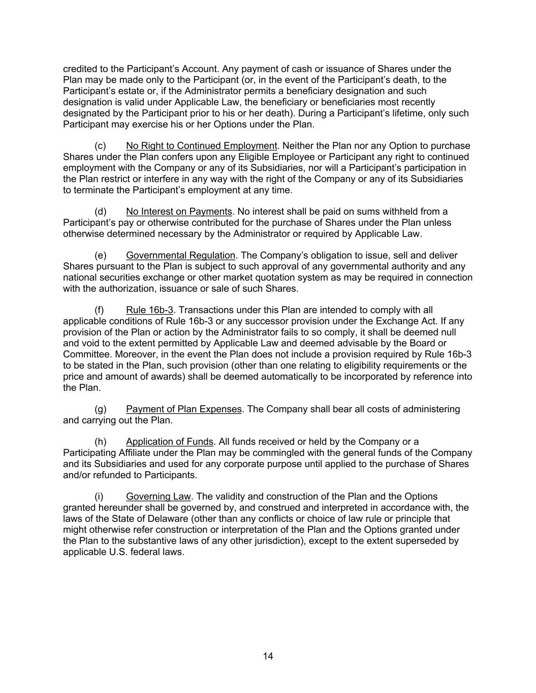 14 credited to the Participant’s Account. Any payment of cash or issuance of Shares under the Plan may be made only to the Participant (or, in the event of the Participant’s death, to the Participant’s estate or, if the Administrator permits a beneficiary designation and such designation is valid under Applicable Law, the beneficiary or beneficiaries most recently designated by the Participant prior to his or her death). During a Participant’s lifetime, only such Participant may exercise his or her Options under the Plan. (c) No Right to Continued Employment. Neither the Plan nor any Option to purchase Shares under the Plan confers upon any Eligible Employee or Participant any right to continued employment with the Company or any of its Subsidiaries, nor will a Participant’s participation in the Plan restrict or interfere in any way with the right of the Company or any of its Subsidiaries to terminate the Participant’s employment at any time. (d) No Interest on Payments. No interest shall be paid on sums withheld from a Participant’s pay or otherwise contributed for the purchase of Shares under the Plan unless otherwise determined necessary by the Administrator or required by Applicable Law. (e) Governmental Regulation. The Company’s obligation to issue, sell and deliver Shares pursuant to the Plan is subject to such approval of any governmental authority and any national securities exchange or other market quotation system as may be required in connection with the authorization, issuance or sale of such Shares. (f) Rule 16b-3. Transactions under this Plan are intended to comply with all applicable conditions of Rule 16b-3 or any successor provision under the Exchange Act. If any provision of the Plan or action by the Administrator fails to so comply, it shall be deemed null and void to the extent permitted by Applicable Law and deemed advisable by the Board or Committee. Moreover, in the event the Plan does not include a provision required by Rule 16b-3 to be stated in the Plan, such provision (other than one relating to eligibility requirements or the price and amount of awards) shall be deemed automatically to be incorporated by reference into the Plan. (g) Payment of Plan Expenses. The Company shall bear all costs of administering and carrying out the Plan. (h) Application of Funds. All funds received or held by the Company or a Participating Affiliate under the Plan may be commingled with the general funds of the Company and its Subsidiaries and used for any corporate purpose until applied to the purchase of Shares and/or refunded to Participants. (i) Governing Law. The validity and construction of the Plan and the Options granted hereunder shall be governed by, and construed and interpreted in accordance with, the laws of the State of Delaware (other than any conflicts or choice of law rule or principle that might otherwise refer construction or interpretation of the Plan and the Options granted under the Plan to the substantive laws of any other jurisdiction), except to the extent superseded by applicable U.S. federal laws.