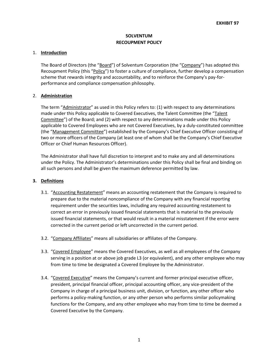1 SOLVENTUM RECOUPMENT POLICY 1. Introduction The Board of Directors (the “Board”) of Solventum Corporation (the “Company”) has adopted this Recoupment Policy (this “Policy”) to foster a culture of compliance, further develop a compensation scheme that rewards integrity and accountability, and to reinforce the Company’s pay-for- performance and compliance compensation philosophy. 2. Administration The term “Administrator” as used in this Policy refers to: (1) with respect to any determinations made under this Policy applicable to Covered Executives, the Talent Committee (the “Talent Committee”) of the Board; and (2) with respect to any determinations made under this Policy applicable to Covered Employees who are not Covered Executives, by a duly-constituted committee (the “Management Committee”) established by the Company’s Chief Executive Officer consisting of two or more officers of the Company (at least one of whom shall be the Company’s Chief Executive Officer or Chief Human Resources Officer). The Administrator shall have full discretion to interpret and to make any and all determinations under the Policy. The Administrator’s determinations under this Policy shall be final and binding on all such persons and shall be given the maximum deference permitted by law. 3. Definitions 3.1. “Accounting Restatement” means an accounting restatement that the Company is required to prepare due to the material noncompliance of the Company with any financial reporting requirement under the securities laws, including any required accounting restatement to correct an error in previously issued financial statements that is material to the previously issued financial statements, or that would result in a material misstatement if the error were corrected in the current period or left uncorrected in the current period. 3.2. “Company Affiliates” means all subsidiaries or affiliates of the Company. 3.3. “Covered Employee” means the Covered Executives, as well as all employees of the Company serving in a position at or above job grade L3 (or equivalent), and any other employee who may from time to time be designated a Covered Employee by the Administrator. 3.4. “Covered Executive” means the Company’s current and former principal executive officer, president, principal financial officer, principal accounting officer, any vice-president of the Company in charge of a principal business unit, division, or function, any other officer who performs a policy-making function, or any other person who performs similar policymaking functions for the Company, and any other employee who may from time to time be deemed a Covered Executive by the Company. EXHIBIT 97