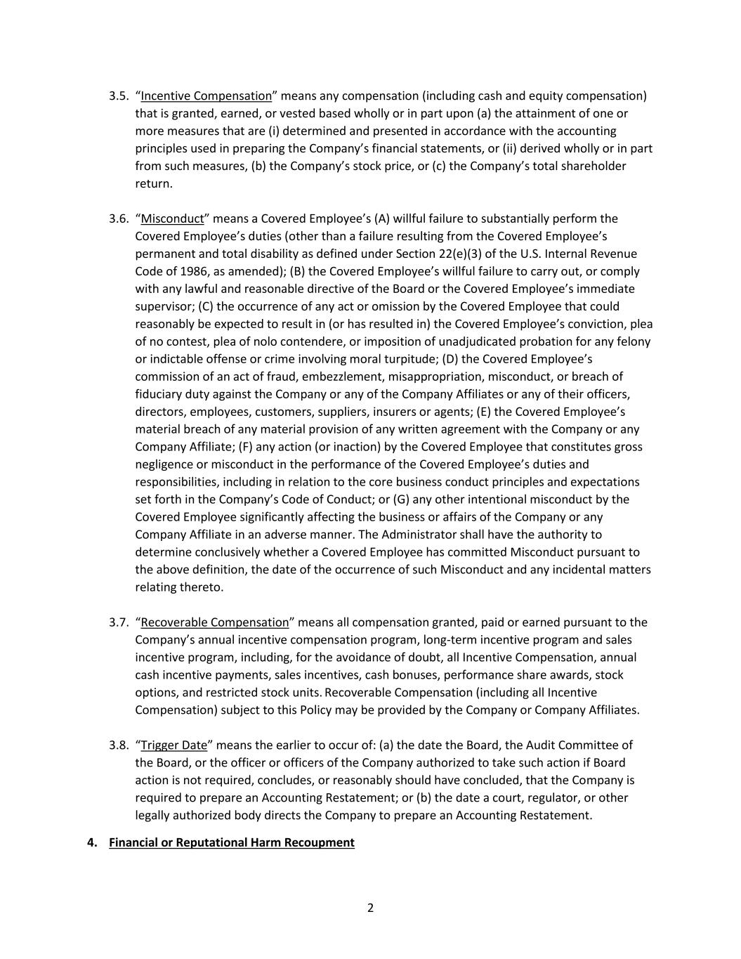 2 3.5. “Incentive Compensation” means any compensation (including cash and equity compensation) that is granted, earned, or vested based wholly or in part upon (a) the attainment of one or more measures that are (i) determined and presented in accordance with the accounting principles used in preparing the Company’s financial statements, or (ii) derived wholly or in part from such measures, (b) the Company’s stock price, or (c) the Company’s total shareholder return. 3.6. “Misconduct” means a Covered Employee’s (A) willful failure to substantially perform the Covered Employee’s duties (other than a failure resulting from the Covered Employee’s permanent and total disability as defined under Section 22(e)(3) of the U.S. Internal Revenue Code of 1986, as amended); (B) the Covered Employee’s willful failure to carry out, or comply with any lawful and reasonable directive of the Board or the Covered Employee’s immediate supervisor; (C) the occurrence of any act or omission by the Covered Employee that could reasonably be expected to result in (or has resulted in) the Covered Employee’s conviction, plea of no contest, plea of nolo contendere, or imposition of unadjudicated probation for any felony or indictable offense or crime involving moral turpitude; (D) the Covered Employee’s commission of an act of fraud, embezzlement, misappropriation, misconduct, or breach of fiduciary duty against the Company or any of the Company Affiliates or any of their officers, directors, employees, customers, suppliers, insurers or agents; (E) the Covered Employee’s material breach of any material provision of any written agreement with the Company or any Company Affiliate; (F) any action (or inaction) by the Covered Employee that constitutes gross negligence or misconduct in the performance of the Covered Employee’s duties and responsibilities, including in relation to the core business conduct principles and expectations set forth in the Company’s Code of Conduct; or (G) any other intentional misconduct by the Covered Employee significantly affecting the business or affairs of the Company or any Company Affiliate in an adverse manner. The Administrator shall have the authority to determine conclusively whether a Covered Employee has committed Misconduct pursuant to the above definition, the date of the occurrence of such Misconduct and any incidental matters relating thereto. 3.7. “Recoverable Compensation” means all compensation granted, paid or earned pursuant to the Company’s annual incentive compensation program, long-term incentive program and sales incentive program, including, for the avoidance of doubt, all Incentive Compensation, annual cash incentive payments, sales incentives, cash bonuses, performance share awards, stock options, and restricted stock units. Recoverable Compensation (including all Incentive Compensation) subject to this Policy may be provided by the Company or Company Affiliates. 3.8. “Trigger Date” means the earlier to occur of: (a) the date the Board, the Audit Committee of the Board, or the officer or officers of the Company authorized to take such action if Board action is not required, concludes, or reasonably should have concluded, that the Company is required to prepare an Accounting Restatement; or (b) the date a court, regulator, or other legally authorized body directs the Company to prepare an Accounting Restatement. 4. Financial or Reputational Harm Recoupment