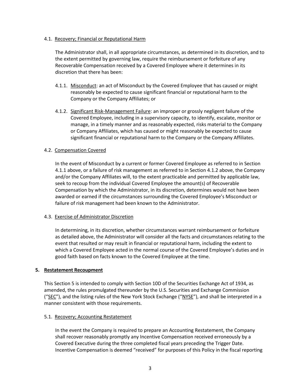 3 4.1. Recovery; Financial or Reputational Harm The Administrator shall, in all appropriate circumstances, as determined in its discretion, and to the extent permitted by governing law, require the reimbursement or forfeiture of any Recoverable Compensation received by a Covered Employee where it determines in its discretion that there has been: 4.1.1. Misconduct: an act of Misconduct by the Covered Employee that has caused or might reasonably be expected to cause significant financial or reputational harm to the Company or the Company Affiliates; or 4.1.2. Significant Risk-Management Failure: an improper or grossly negligent failure of the Covered Employee, including in a supervisory capacity, to identify, escalate, monitor or manage, in a timely manner and as reasonably expected, risks material to the Company or Company Affiliates, which has caused or might reasonably be expected to cause significant financial or reputational harm to the Company or the Company Affiliates. 4.2. Compensation Covered In the event of Misconduct by a current or former Covered Employee as referred to in Section 4.1.1 above, or a failure of risk management as referred to in Section 4.1.2 above, the Company and/or the Company Affiliates will, to the extent practicable and permitted by applicable law, seek to recoup from the individual Covered Employee the amount(s) of Recoverable Compensation by which the Administrator, in its discretion, determines would not have been awarded or earned if the circumstances surrounding the Covered Employee’s Misconduct or failure of risk management had been known to the Administrator. 4.3. Exercise of Administrator Discretion In determining, in its discretion, whether circumstances warrant reimbursement or forfeiture as detailed above, the Administrator will consider all the facts and circumstances relating to the event that resulted or may result in financial or reputational harm, including the extent to which a Covered Employee acted in the normal course of the Covered Employee’s duties and in good faith based on facts known to the Covered Employee at the time. 5. Restatement Recoupment This Section 5 is intended to comply with Section 10D of the Securities Exchange Act of 1934, as amended, the rules promulgated thereunder by the U.S. Securities and Exchange Commission (“SEC”), and the listing rules of the New York Stock Exchange (“NYSE”), and shall be interpreted in a manner consistent with those requirements. 5.1. Recovery; Accounting Restatement In the event the Company is required to prepare an Accounting Restatement, the Company shall recover reasonably promptly any Incentive Compensation received erroneously by a Covered Executive during the three completed fiscal years preceding the Trigger Date. Incentive Compensation is deemed “received” for purposes of this Policy in the fiscal reporting