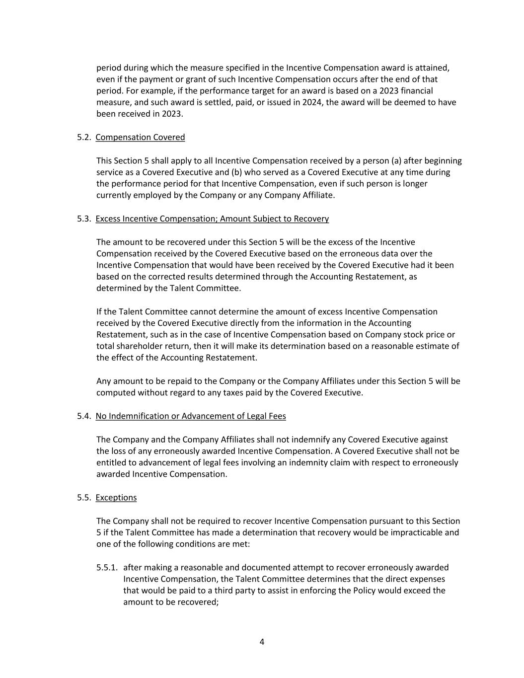 4 period during which the measure specified in the Incentive Compensation award is attained, even if the payment or grant of such Incentive Compensation occurs after the end of that period. For example, if the performance target for an award is based on a 2023 financial measure, and such award is settled, paid, or issued in 2024, the award will be deemed to have been received in 2023. 5.2. Compensation Covered This Section 5 shall apply to all Incentive Compensation received by a person (a) after beginning service as a Covered Executive and (b) who served as a Covered Executive at any time during the performance period for that Incentive Compensation, even if such person is longer currently employed by the Company or any Company Affiliate. 5.3. Excess Incentive Compensation; Amount Subject to Recovery The amount to be recovered under this Section 5 will be the excess of the Incentive Compensation received by the Covered Executive based on the erroneous data over the Incentive Compensation that would have been received by the Covered Executive had it been based on the corrected results determined through the Accounting Restatement, as determined by the Talent Committee. If the Talent Committee cannot determine the amount of excess Incentive Compensation received by the Covered Executive directly from the information in the Accounting Restatement, such as in the case of Incentive Compensation based on Company stock price or total shareholder return, then it will make its determination based on a reasonable estimate of the effect of the Accounting Restatement. Any amount to be repaid to the Company or the Company Affiliates under this Section 5 will be computed without regard to any taxes paid by the Covered Executive. 5.4. No Indemnification or Advancement of Legal Fees The Company and the Company Affiliates shall not indemnify any Covered Executive against the loss of any erroneously awarded Incentive Compensation. A Covered Executive shall not be entitled to advancement of legal fees involving an indemnity claim with respect to erroneously awarded Incentive Compensation. 5.5. Exceptions The Company shall not be required to recover Incentive Compensation pursuant to this Section 5 if the Talent Committee has made a determination that recovery would be impracticable and one of the following conditions are met: 5.5.1. after making a reasonable and documented attempt to recover erroneously awarded Incentive Compensation, the Talent Committee determines that the direct expenses that would be paid to a third party to assist in enforcing the Policy would exceed the amount to be recovered;