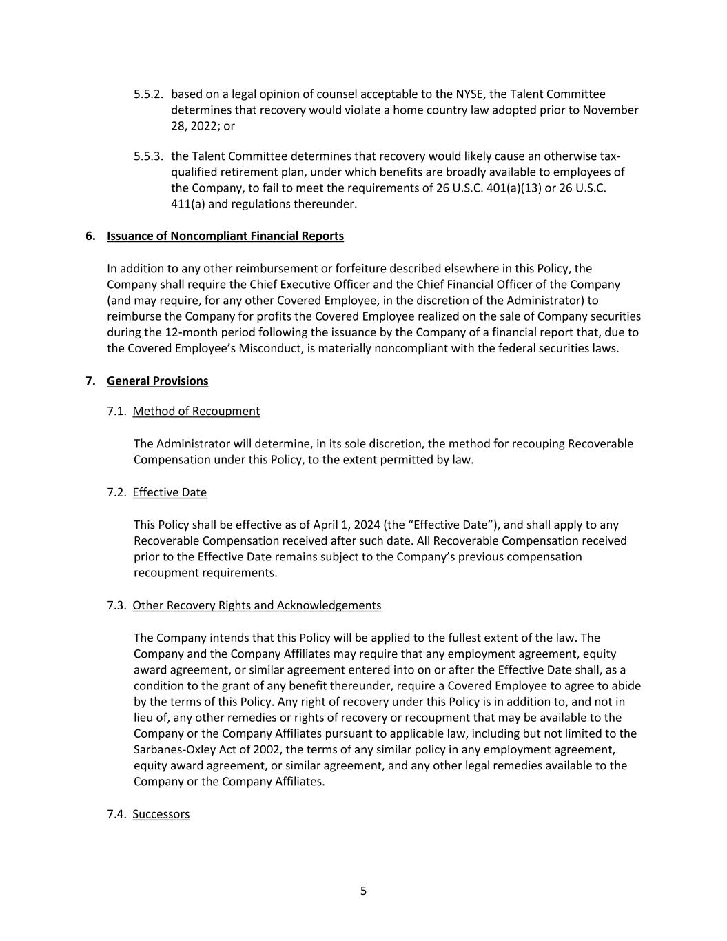 5 5.5.2. based on a legal opinion of counsel acceptable to the NYSE, the Talent Committee determines that recovery would violate a home country law adopted prior to November 28, 2022; or 5.5.3. the Talent Committee determines that recovery would likely cause an otherwise tax- qualified retirement plan, under which benefits are broadly available to employees of the Company, to fail to meet the requirements of 26 U.S.C. 401(a)(13) or 26 U.S.C. 411(a) and regulations thereunder. 6. Issuance of Noncompliant Financial Reports In addition to any other reimbursement or forfeiture described elsewhere in this Policy, the Company shall require the Chief Executive Officer and the Chief Financial Officer of the Company (and may require, for any other Covered Employee, in the discretion of the Administrator) to reimburse the Company for profits the Covered Employee realized on the sale of Company securities during the 12‑month period following the issuance by the Company of a financial report that, due to the Covered Employee’s Misconduct, is materially noncompliant with the federal securities laws. 7. General Provisions 7.1. Method of Recoupment The Administrator will determine, in its sole discretion, the method for recouping Recoverable Compensation under this Policy, to the extent permitted by law. 7.2. Effective Date This Policy shall be effective as of April 1, 2024 (the “Effective Date”), and shall apply to any Recoverable Compensation received after such date. All Recoverable Compensation received prior to the Effective Date remains subject to the Company’s previous compensation recoupment requirements. 7.3. Other Recovery Rights and Acknowledgements The Company intends that this Policy will be applied to the fullest extent of the law. The Company and the Company Affiliates may require that any employment agreement, equity award agreement, or similar agreement entered into on or after the Effective Date shall, as a condition to the grant of any benefit thereunder, require a Covered Employee to agree to abide by the terms of this Policy. Any right of recovery under this Policy is in addition to, and not in lieu of, any other remedies or rights of recovery or recoupment that may be available to the Company or the Company Affiliates pursuant to applicable law, including but not limited to the Sarbanes-Oxley Act of 2002, the terms of any similar policy in any employment agreement, equity award agreement, or similar agreement, and any other legal remedies available to the Company or the Company Affiliates. 7.4. Successors