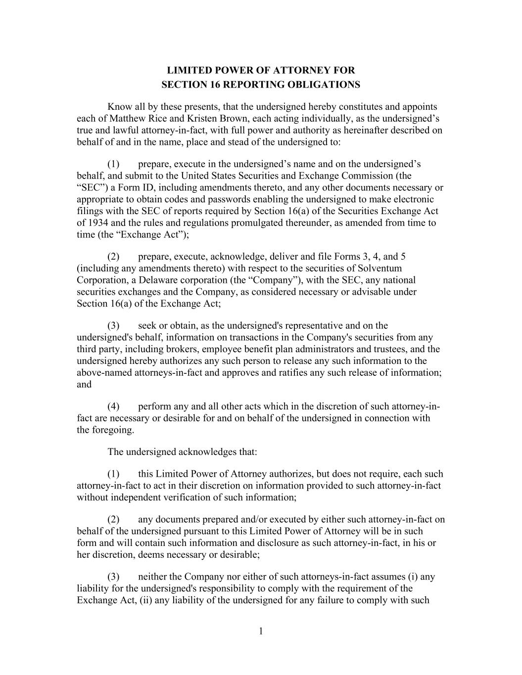 1 LIMITED POWER OF ATTORNEY FOR SECTION 16 REPORTING OBLIGATIONS Know all by these presents, that the undersigned hereby constitutes and appoints each of Matthew Rice and Kristen Brown, each acting individually, as the undersigned’s true and lawful attorney-in-fact, with full power and authority as hereinafter described on behalf of and in the name, place and stead of the undersigned to: (1) prepare, execute in the undersigned’s name and on the undersigned’s behalf, and submit to the United States Securities and Exchange Commission (the “SEC”) a Form ID, including amendments thereto, and any other documents necessary or appropriate to obtain codes and passwords enabling the undersigned to make electronic filings with the SEC of reports required by Section 16(a) of the Securities Exchange Act of 1934 and the rules and regulations promulgated thereunder, as amended from time to time (the “Exchange Act”); (2) prepare, execute, acknowledge, deliver and file Forms 3, 4, and 5 (including any amendments thereto) with respect to the securities of Solventum Corporation, a Delaware corporation (the “Company”), with the SEC, any national securities exchanges and the Company, as considered necessary or advisable under Section 16(a) of the Exchange Act; (3) seek or obtain, as the undersigned's representative and on the undersigned's behalf, information on transactions in the Company's securities from any third party, including brokers, employee benefit plan administrators and trustees, and the undersigned hereby authorizes any such person to release any such information to the above-named attorneys-in-fact and approves and ratifies any such release of information; and (4) perform any and all other acts which in the discretion of such attorney-in- fact are necessary or desirable for and on behalf of the undersigned in connection with the foregoing. The undersigned acknowledges that: (1) this Limited Power of Attorney authorizes, but does not require, each such attorney-in-fact to act in their discretion on information provided to such attorney-in-fact without independent verification of such information; (2) any documents prepared and/or executed by either such attorney-in-fact on behalf of the undersigned pursuant to this Limited Power of Attorney will be in such form and will contain such information and disclosure as such attorney-in-fact, in his or her discretion, deems necessary or desirable; (3) neither the Company nor either of such attorneys-in-fact assumes (i) any liability for the undersigned's responsibility to comply with the requirement of the Exchange Act, (ii) any liability of the undersigned for any failure to comply with such