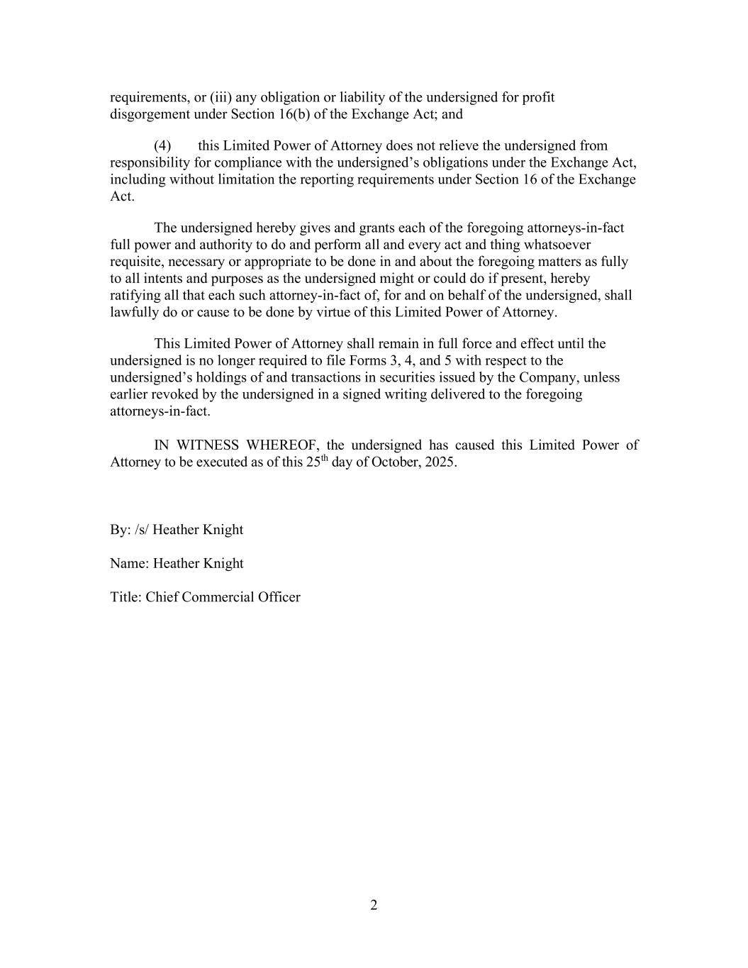 2 requirements, or (iii) any obligation or liability of the undersigned for profit disgorgement under Section 16(b) of the Exchange Act; and (4) this Limited Power of Attorney does not relieve the undersigned from responsibility for compliance with the undersigned’s obligations under the Exchange Act, including without limitation the reporting requirements under Section 16 of the Exchange Act. The undersigned hereby gives and grants each of the foregoing attorneys-in-fact full power and authority to do and perform all and every act and thing whatsoever requisite, necessary or appropriate to be done in and about the foregoing matters as fully to all intents and purposes as the undersigned might or could do if present, hereby ratifying all that each such attorney-in-fact of, for and on behalf of the undersigned, shall lawfully do or cause to be done by virtue of this Limited Power of Attorney. This Limited Power of Attorney shall remain in full force and effect until the undersigned is no longer required to file Forms 3, 4, and 5 with respect to the undersigned’s holdings of and transactions in securities issued by the Company, unless earlier revoked by the undersigned in a signed writing delivered to the foregoing attorneys-in-fact. IN WITNESS WHEREOF, the undersigned has caused this Limited Power of Attorney to be executed as of this 25th day of October, 2025. By: /s/ Heather Knight Name: Heather Knight Title: Chief Commercial Officer